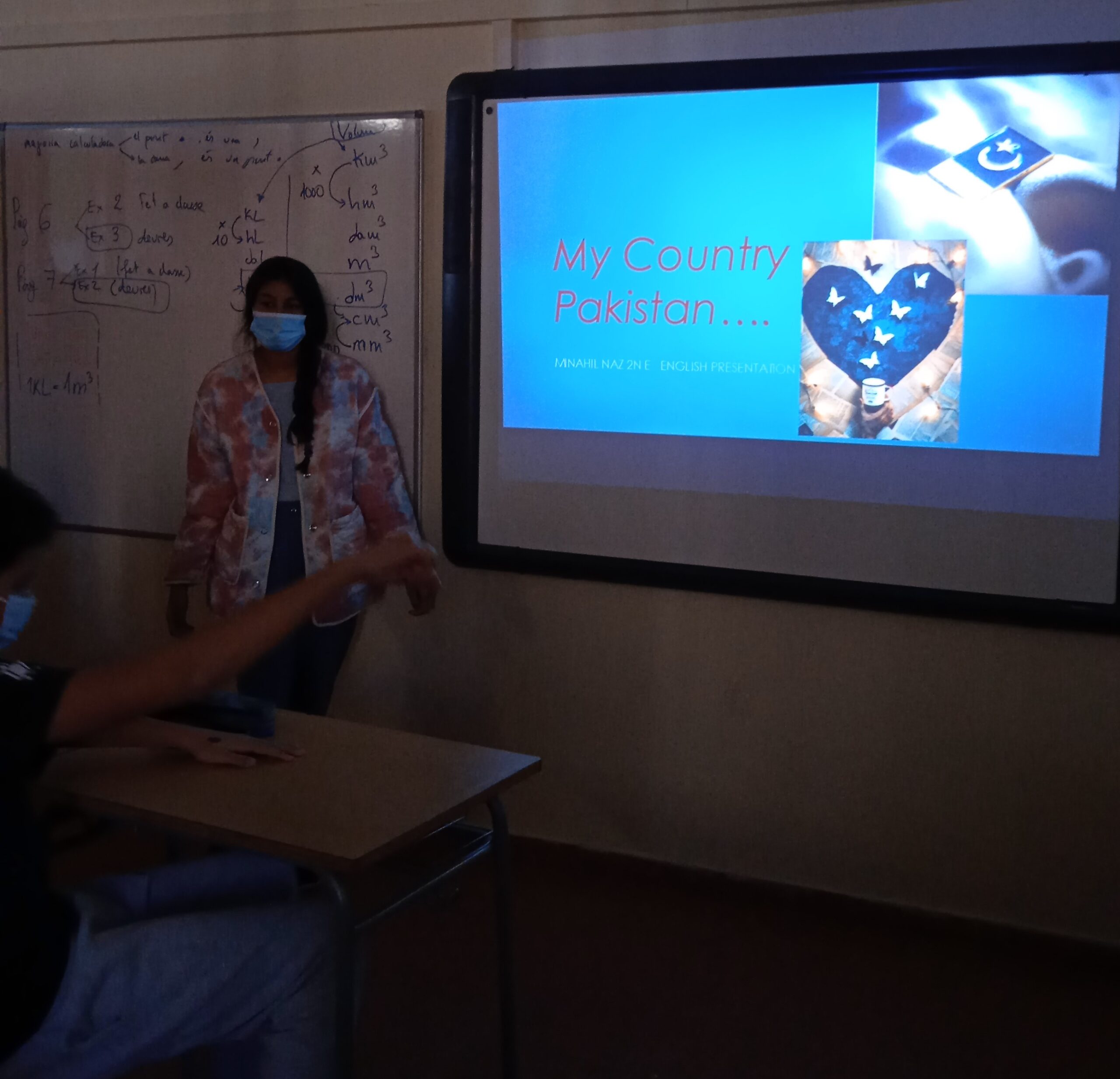La setmana passada, a classe d’anglès de 2n ESO E, la Mina Naz ens va fer una exposició en anglès del seu país, Pakistan. Tots els seus companys de classe estaven molt interessats a conèixer la música tradicional, l’esport nacional o la geografia del seu país. Després de la seva presentació, els nois i noies de 2n E han fet preguntes en anglès sobre l’exposició.