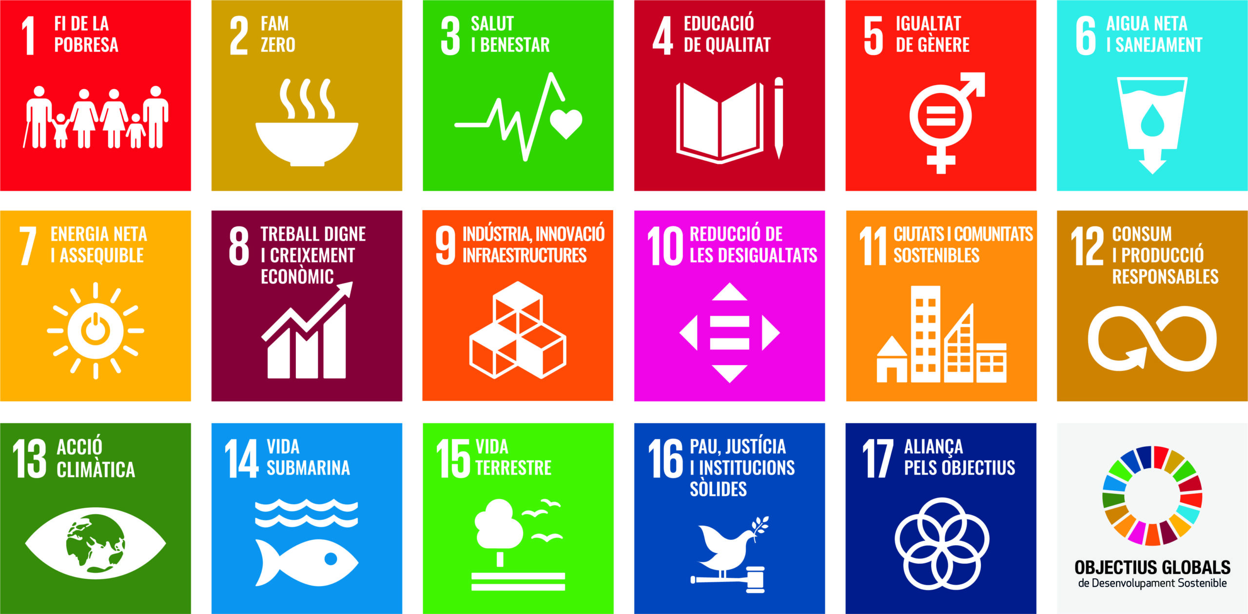 Els ODS ens impulsen a actuar conjuntament per erradicar la pobresa, protegir el planeta i assegurar una vida digna per a tothom. No només aborden l’àmbit mediambiental, sinó també qüestions socials i econòmiques: Sostenibilitat Ambiental (aigua, energia, canvi climàtic, ecosistemes…), Justícia Social i Benestar (educació, salut, igualtat, pau, drets humans…) i Desenvolupament Econòmic i Aliances (treball digne, innovació, ciutats sostenibles, cooperació…).