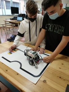 Els grups de treball, compostos de 2 alumnes cadascun, hauran de competir per aconseguir diferents reptes, com ara: identificar colors emetent sons, moure’s a través d’un camí marcat, etc…