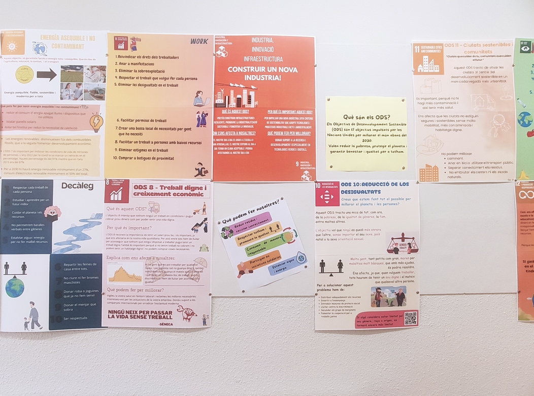 Per reforçar el missatge d’aquest projecte, hem penjat murals pels passadissos del centre per conscienciar els nostres companys sobre la importància de fer petits canvis a la seva vida diària. A més, hi hem inclòs consells pràctics per contribuir als ODS, amb l’objectiu de crear una comunitat més conscient i activa en la preservació del nostre planeta.