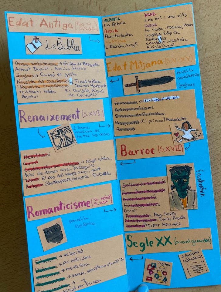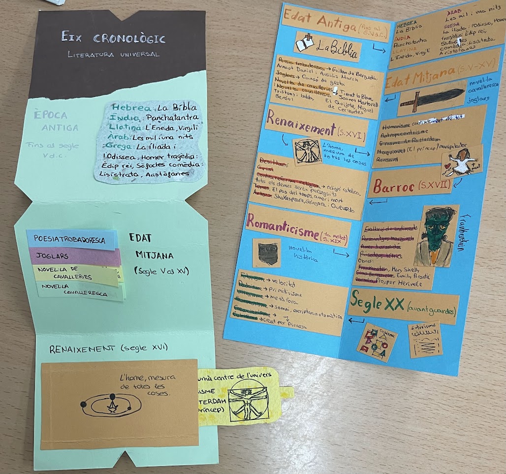 El nostre alumnat de 1r de Batxillerat des de la matèria Literatura Universal ha fet una primera incursió a la història universal de la literatura. Han realitzat uns eixos cronològics que concentren les èpoques literàries, des de la Bíblia, el Panchatantra o Les mil i una nits fins a obres de les avantguardes del segle XX.