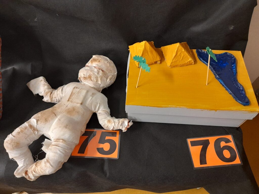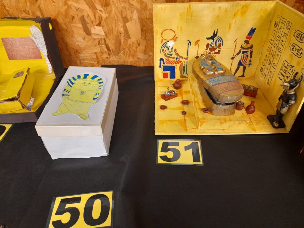 Els alumnes van participar activament en la creació de les obres exposades. Alguns van elaborar dibuixos detallats de mòmies, mentre que d’altres van construir maquetes de mòmies i sarcòfags utilitzant materials diversos.
