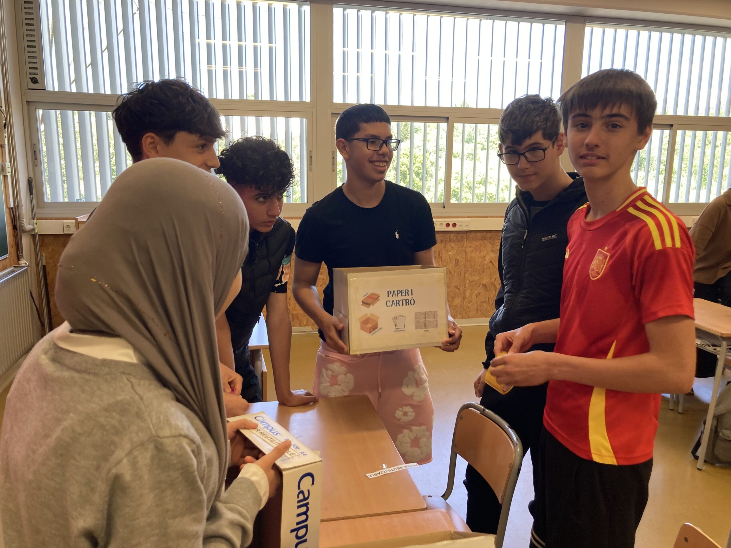 L’alumnat ha fet la construcció d’aquest material per tal que a les aules es pugui reciclar el paper i cartró, la resta i tenir al seu abast folis reutilitzables.