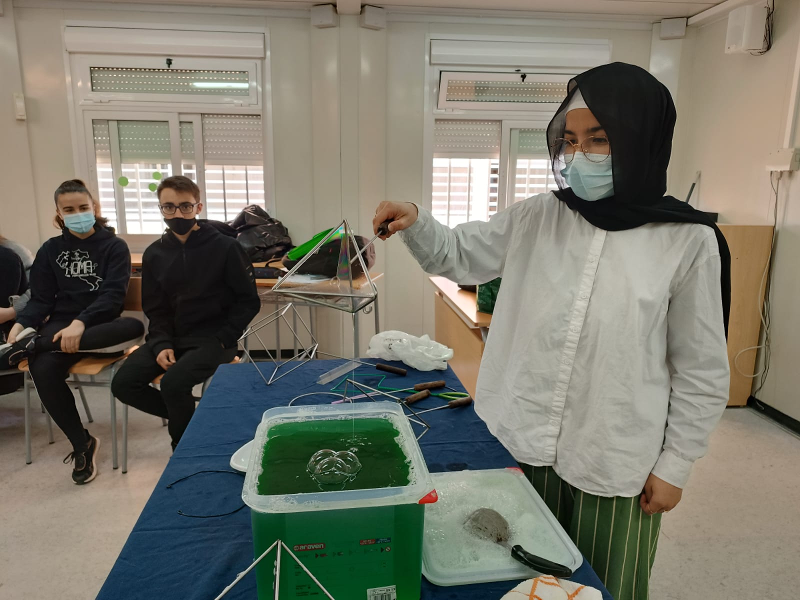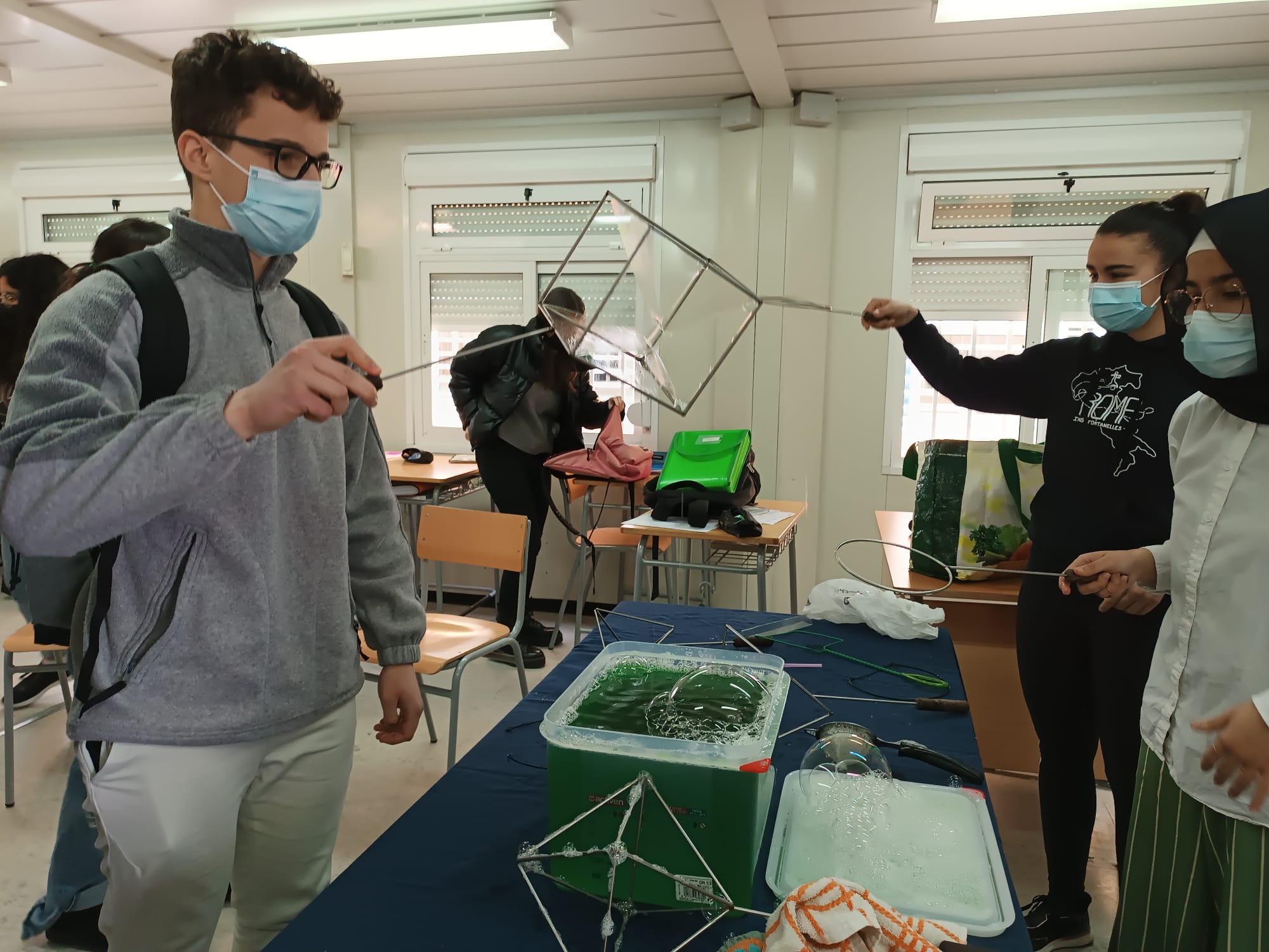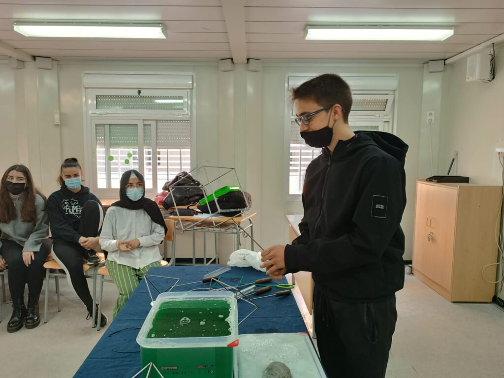 Els alumnes de 2n de batxillerat han treballat la visualització de punts, rectes i plans a l’espai amb bombolles de sabó. Les bombolles resolen problemes d’optimització complexos en pocs segons. Voleu dir que les bombolles saben matemàtiques? O que les matemàtiques estan a molts més llocs dels que ens imaginem?