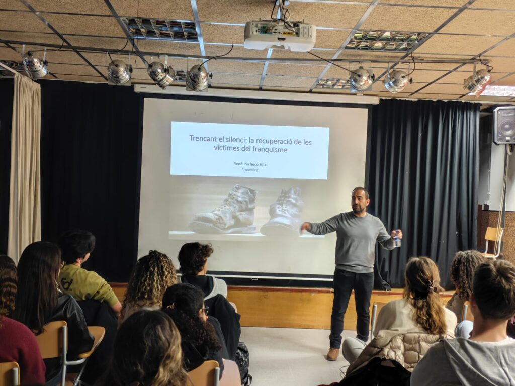 Els alumnes de 2n de batxillerat van assistir a la xerrada Trencant el silenci: la recuperació de les víctimes del franquisme a càrrec René Pacheco, arqueòleg i historiador especialitzat en la localització i exhumació de fosses de la Guerra Civil i la dictadura franquista, membre l’Associació per a la Recuperació de la Memòria Històrica (ARMH).