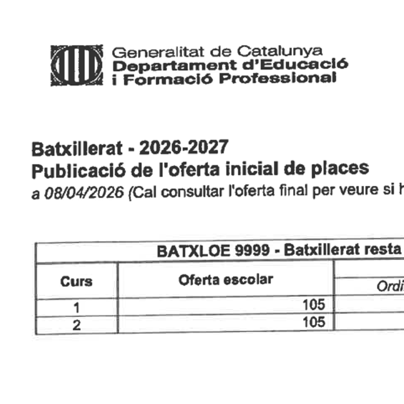 S’ha publicat l’oferta inicial de places de batxillerat per alumnes d’altres centres. Podeu consultar les places entrant al següent document o fent clic a la imatge.