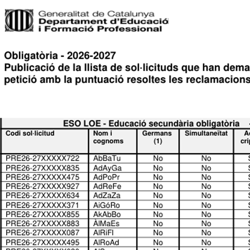 S’ha publicat la llista de sol·licituds amb la baremació definitiva de les famílies que han demanat el nostre centre.