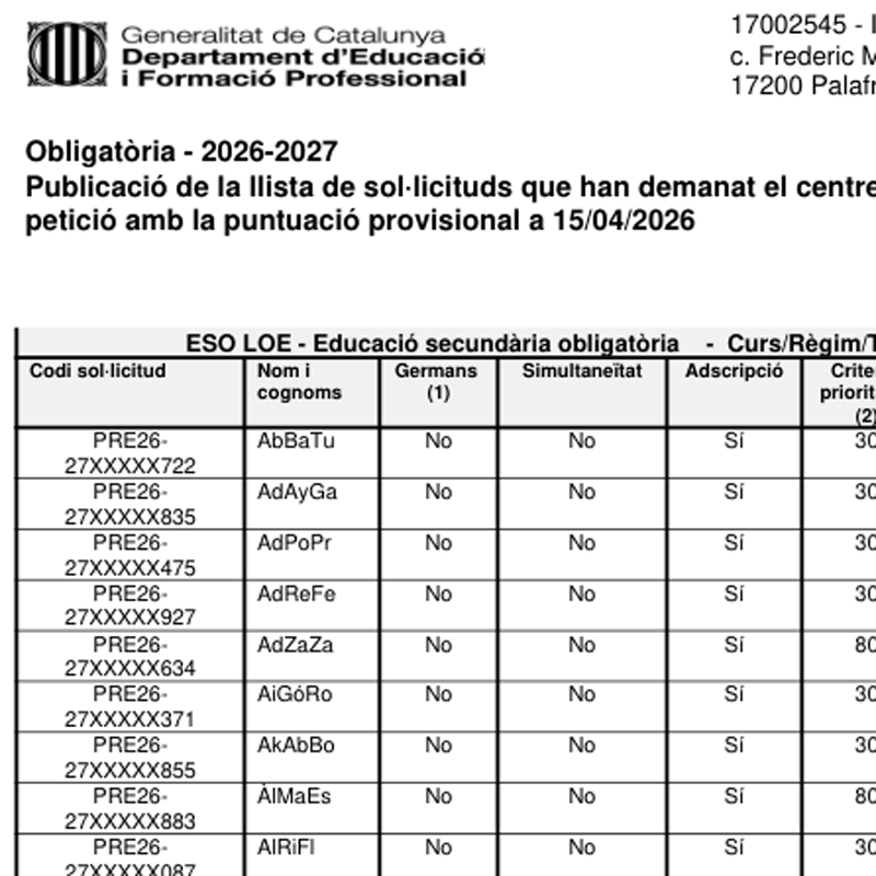 S’ha publicat la llista de sol·licituds amb la baremació provisional que han demanat el nostre centre.