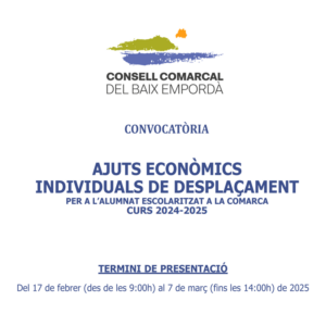 El dia 17 de febrer de 2025 s’inicia el termini per demanar ajuts econòmics per desplaçaments escolars al consell comarcal del Baix Empordà. La presentació de sol·licituds estarà oberta des del mateix dia 17 de febrer i fins el dia 7 de març, i es podrà fer de forma presencial o telemàtica.