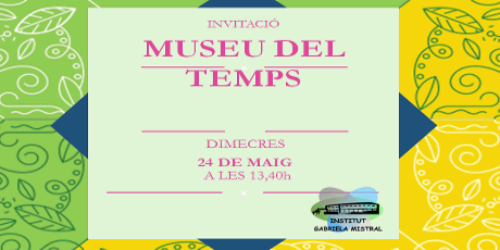 Demà 24 de maig, els alumnes de 1r d’ESO conviden a les seves famílies a la inauguració del Museu del Temps. Amb aquesta activitat es finalitzarà el projecte de 1r d’ESO Recuperem el món que s’ha dut a terme durant aquest curs. Podeu veure totes les fotografies fent clic AQUÍ