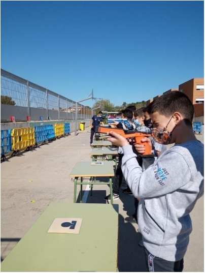 Com a part més lúdica del projecte es va fer un LASER RUN i ESGRIMA. El Laser run és una disciplina dins del pentatlon, en la qual mitjançant una pistola laser els alumnes havíen d’encertar un objectiu que es trobava a 2.5 m de distància. Es tracta d’encertar el més ràpid possible per a poder fer una cursa i fer un relleu a un company. A través de la punteria i l’esport els alumnes van gaudir d’una jornada a l’aire lliure on van poder posar en pràctica molts dels elements apresos durant el desenvolupament del projecte