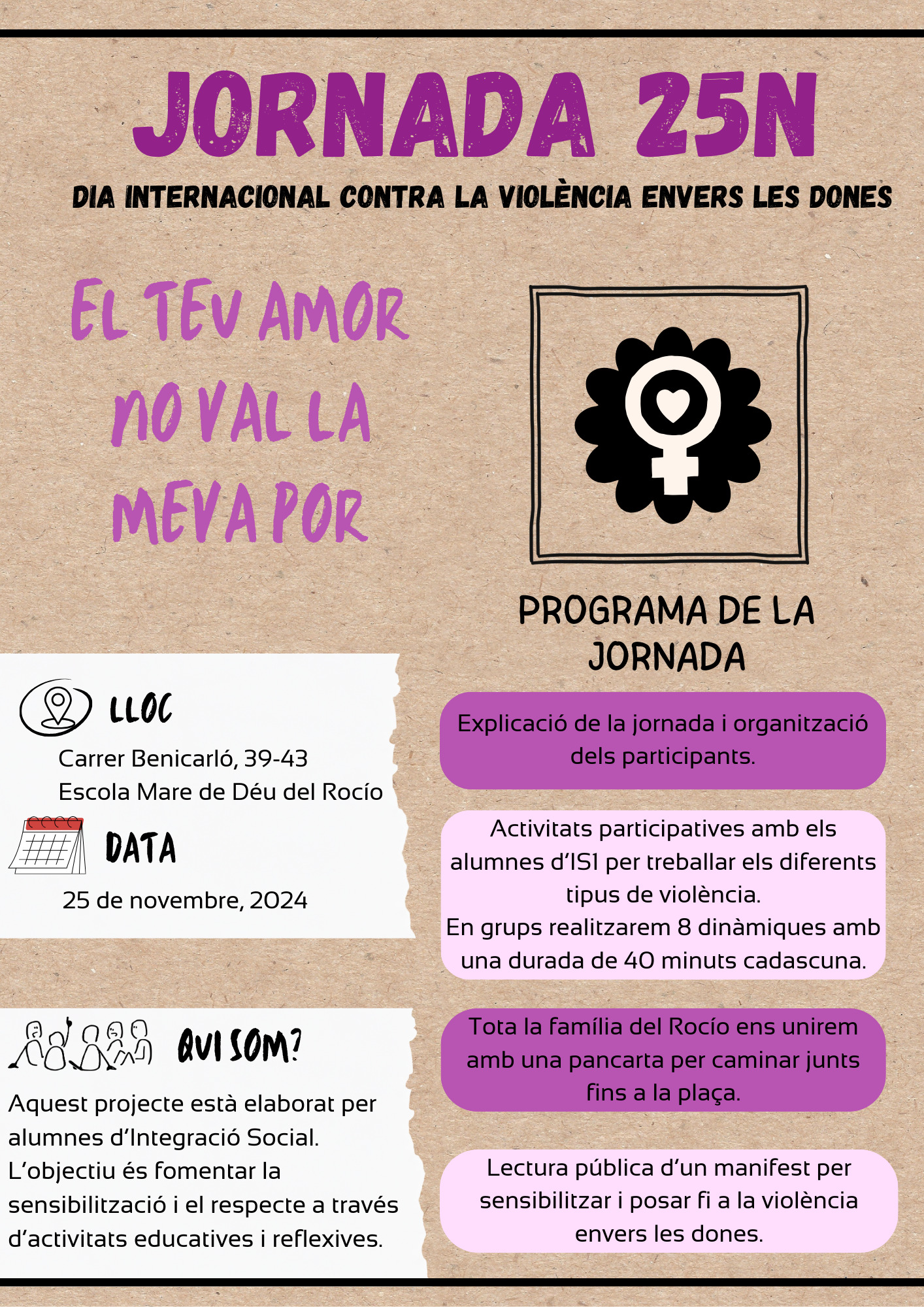 L’alumnat de primer del CFGS d’Integració Social hem elaborat un projecte pel 25 N, el dia en contra de la violència de gènere. Els objectius del projecte són: prendre consciència sobre la violència de gènere, potenciar el compromís amb la lluita contra la violència de gènere i promoure la igualtat i el bon tracte cap a les dones. Amb una sèrie de reptes, hem reflexionat sobre la violència de gènere i hem promogut valors de respecte i igualtat. Hem treballat en el projecte durant la setmana del 18 al 22 de novembre i el dia 25N tindran lloc les activitats que hem preparat. Ens hem dividit en 8 grups i cadascun d’ells ha investigat un tipus de violència, dos grups han investigat sobre la violència psicològica i altres dos sobre la violència digital, els 4 grups restants han estudiat cadascun la violència física, la violència vicària i la violència sexual.