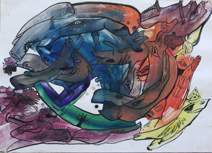 Es vol reconèixer la recerca pictòrica de Carles Giné adquirint dues obres d’una sèrie més extensa que formava un conjunt de força coherència i interès. Es van fer durant sessions de gran concentració, en les quals, sense partir d’esbossos previs, s´anaven dibuixant les figures sobre taques aplicades desacuradament. El pensament flueix de manera immediata, el quadre surt d’una tacada, sense rectificacions. Les imatges estan disposades en un espai all-over, es a dir, no estan ordenades jeràrquicament i ha desaparegut la idea de part superior i inferior del quadre. Son quadres que es podrien mirar des dels quatre costats doncs se’ls hi anava donant la volta mentre s’anaven pintant.