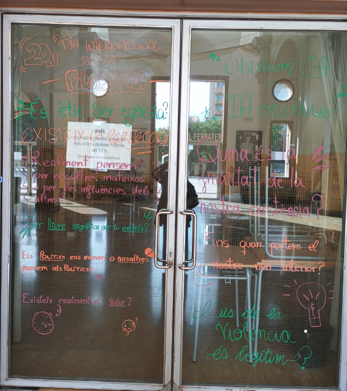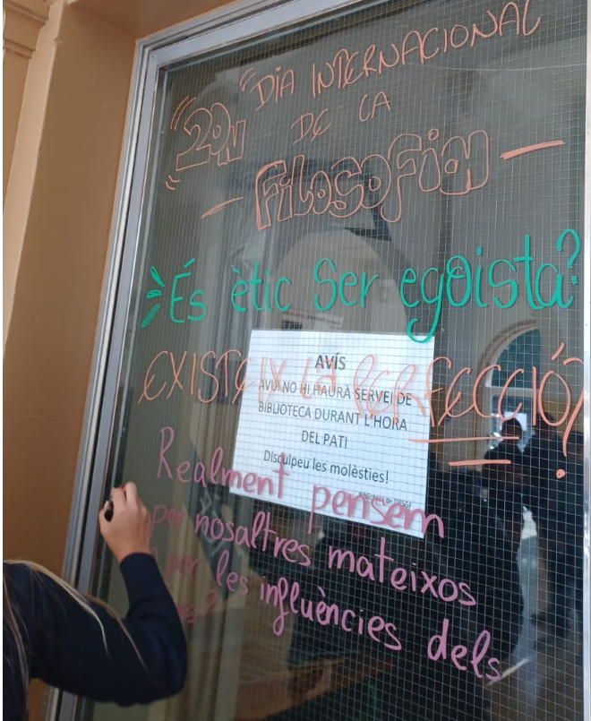 La setmana del 17 al 21 de novembre, el vestíbul del nostre institut s’ha transformat en un espai de reflexió i debat. Amb motiu del Dia Mundial de la Filosofia (20 de novembre), l’alumnat de 4t d’ESO i de Batxillerat ha pres el protagonisme per demostrar que les grans preguntes de la humanitat continuen més vigents que mai.