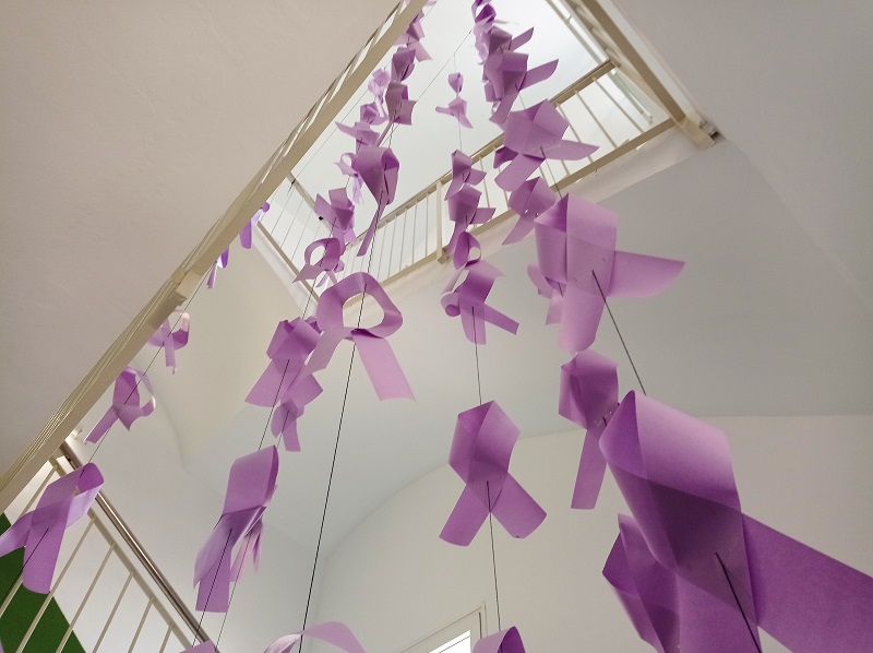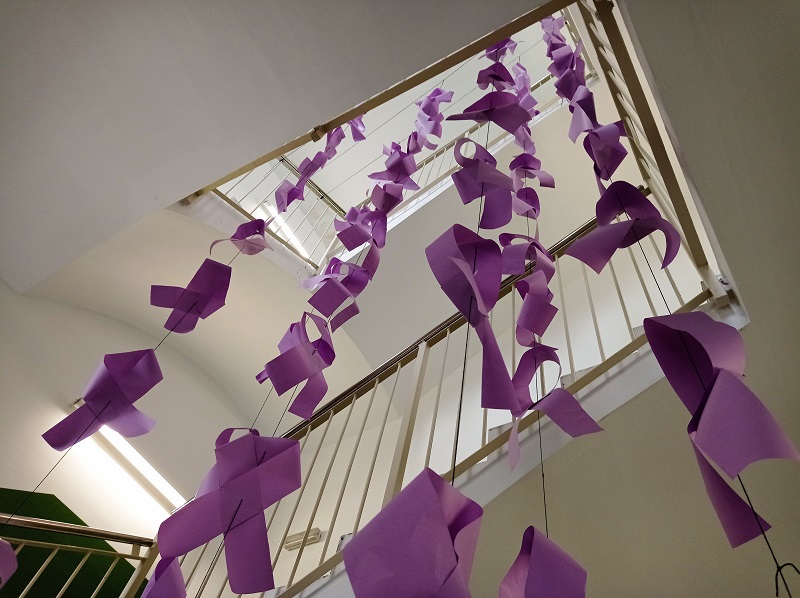 Els alumnes de 1r de Batxillerat de la matèria de Volum han elaborat una instal·lació artística amb motiu del 25N. Són llaços solidaris que omplen en silenci dues de les escales d’accés a les aules. Acció que travessa el buit per dir prou a tot tipus de violències masclistes i que posa de manifest la importància del treball col·laboratiu per aconseguir-ho.