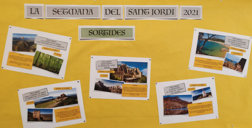 Aquest any el dia de Sant Jordi, degut a l’actual situació d’excepcionalitat, es convertirà en la setmana de Sant Jordi amb la programació de diferents tallers (el dilluns, dimarts i dimecres) i les sortides a la natura organitzades pel dijous dia 22. Finalment, el divendres 23 tindrà lloc la festa del certamen literari.