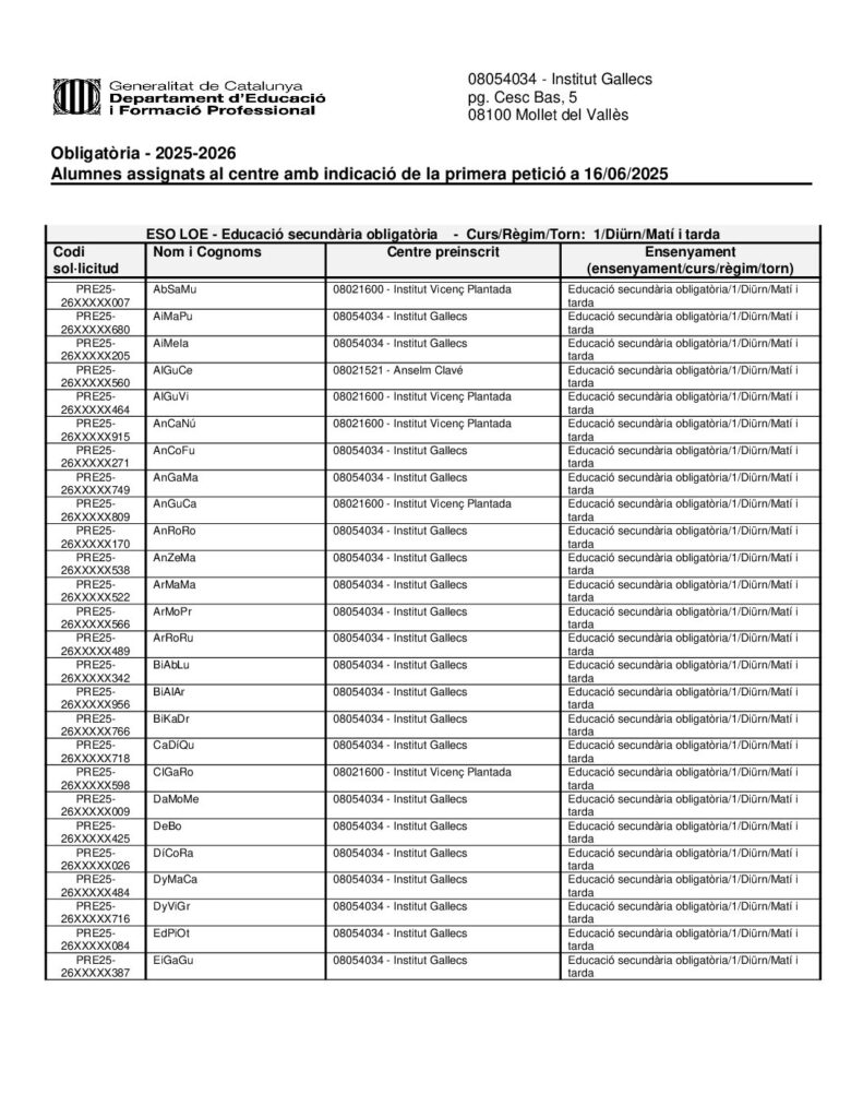 A continuació trobareu en els següents enllaços els documents publicats de les llistes provisionals de graus mitjans i superiors a data 27/06/2025. Publicació de la llista de sol·licituds que han demanat el centre i l’ensenyament en primera petició amb la puntuació provisional a 27/06/2025 Publicació de la llista de sol·licituds que han demanat el centre […]