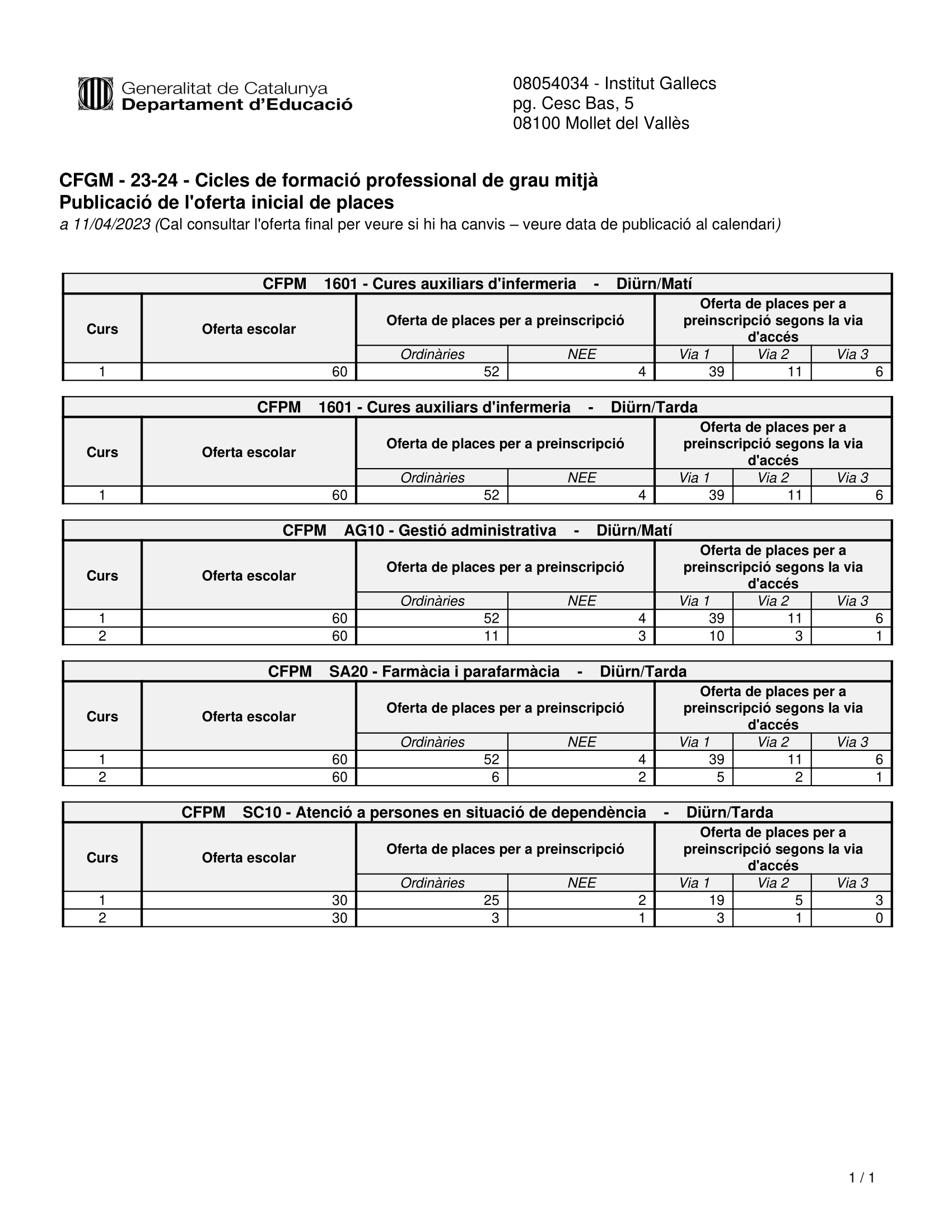 Oferta places Cicle Mitjà 2023/2024Per Comunicació de l'Institut Gallecs / 10 d'abril de 2023 / General Portada / grau mitjà Consulteu OFERTA PLACES CFGM Cicle Mitjà pel curs 2023/2024 de l’INS Gallecs.