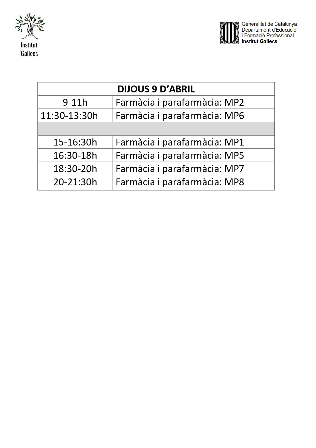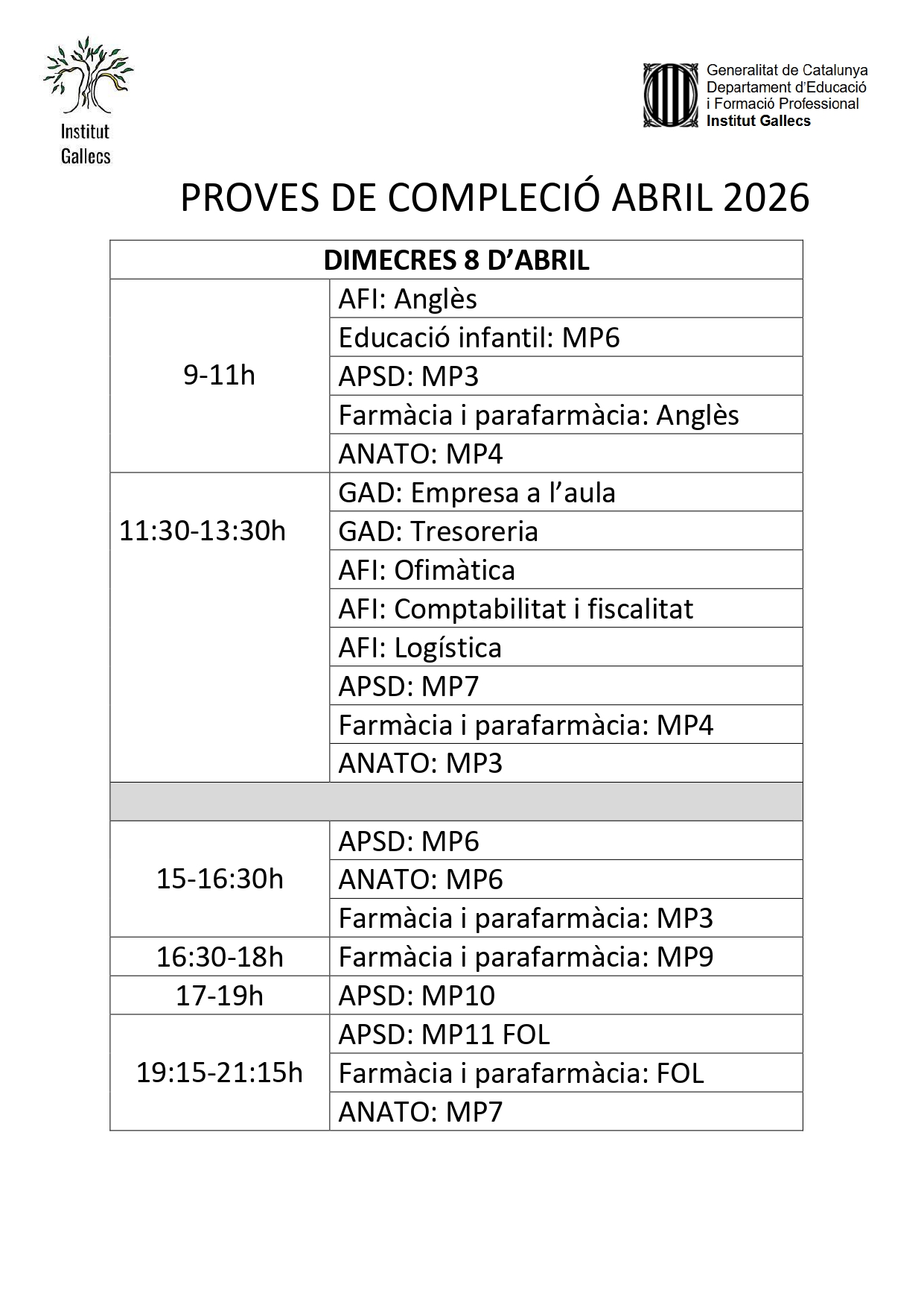 A continuació trobareu el calendari de les proves de compleció que es faran al llarg d’aquest mes d’abril del curs 2026.