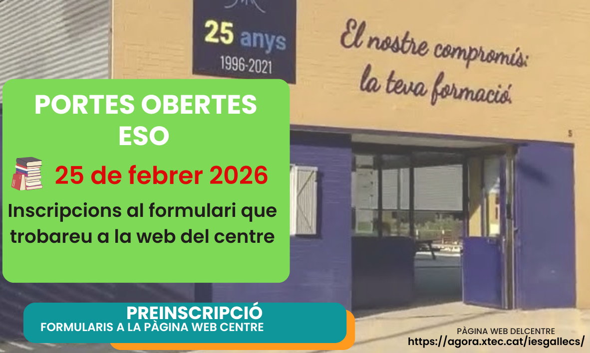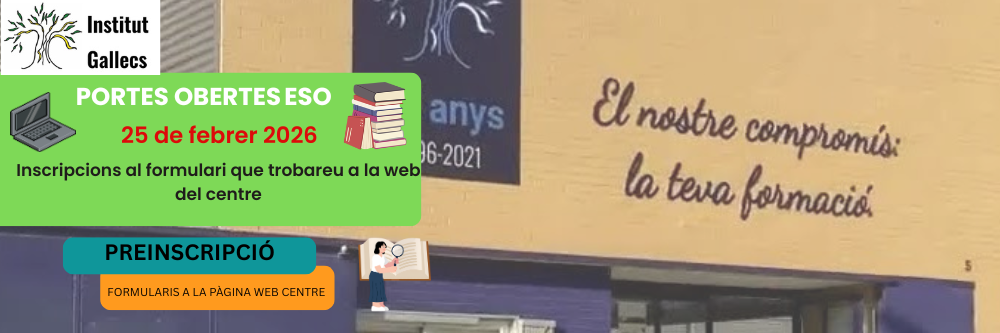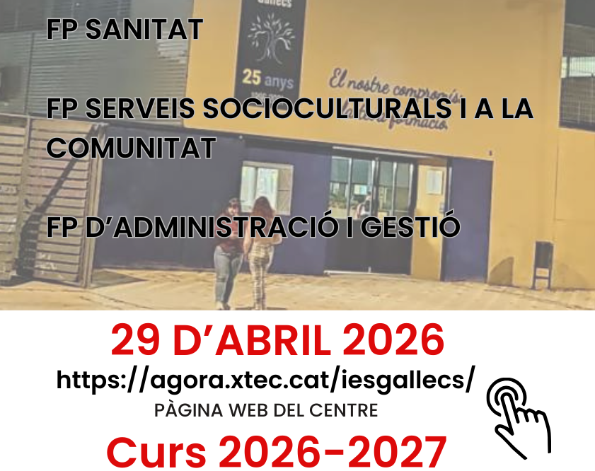 El 29 d’abril serà el dia de portes obertes per a cicles formatius a l’Institut Gallecs. En els pròxims dies obrirem els formularis d’inscripció a la nostra pàgina web per assignar el torn de la visita, que serà en horari de tarda. En el nostre centre tenim cicles formatius de l’àmbit sanitari, serveis socioculturals i […]