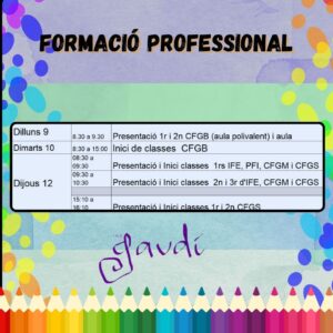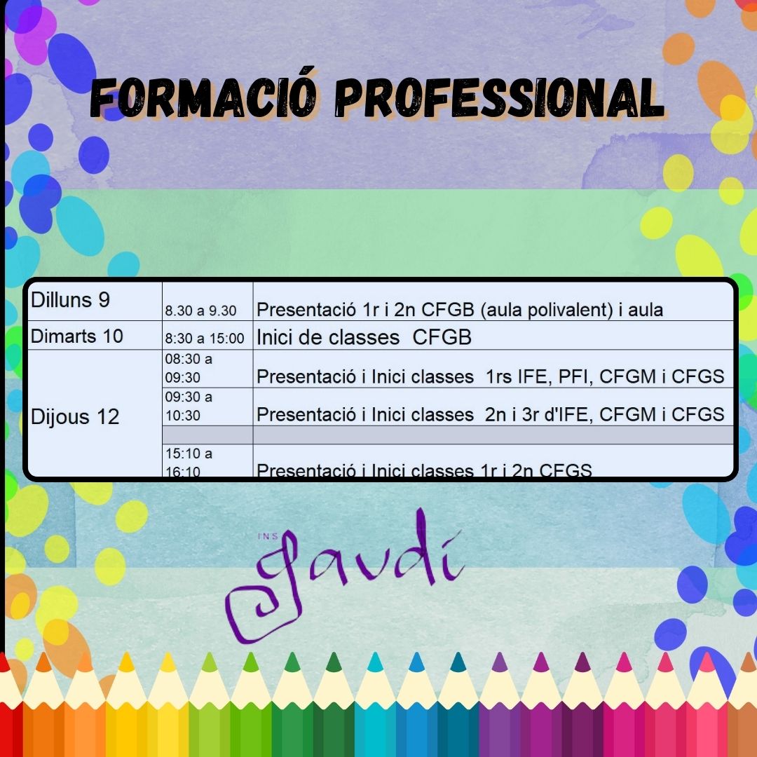 Inici curs 2024-2025 Formació Professional Feu un comentari / Per Notícies Institut Gaudí / 05/08/2024 / Formació Professional Portada DILLUNS 9 de setembre i DIJOUS 12 de setembre!!