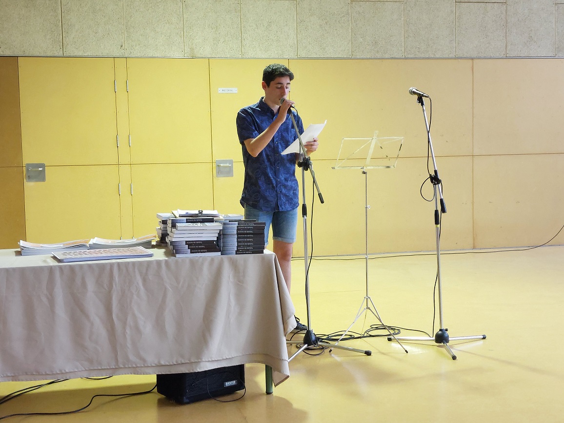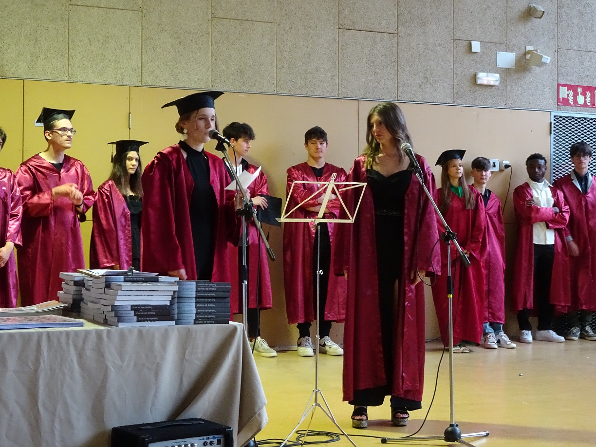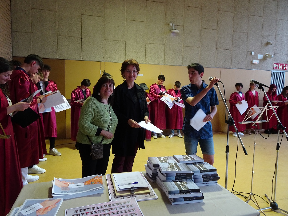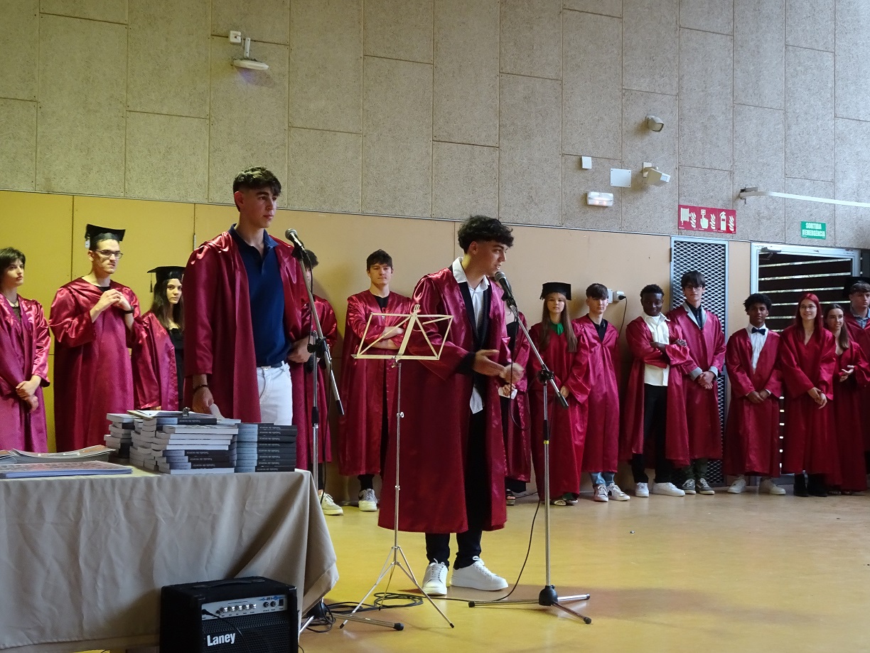 Part de l’alumnat de segon de batxillerat va realitzar un petit discurs de comiat cap als seus companys i cap a la tasca del professorat que els ha acompanyat i recolzat durant el seu pas pel centre. Les presentadores van ser l’Alina Derekovshka, la Jana Ribera com a representants del segon de batxillerat A, la Núria Colom i la Irene Herrera com a representants del segon de batxillerat B i finalment, per part de l’alumnat de Batxibac, en Kevin Acera i l’Esteve Gaona també van expressar el seu agraïment per tota la involucració del seu professorat. Així mateix, l’Eugènia López i la Marina Bonilla, representants de les tres tutores de grup juntament amb la Maribel Jodar, es van dirigir als seus tutorats fent un breu recordatori de l’etapa exigent que representa el batxillerat i a l’hora animant-los a trobar noves oportunitats per aprendre.