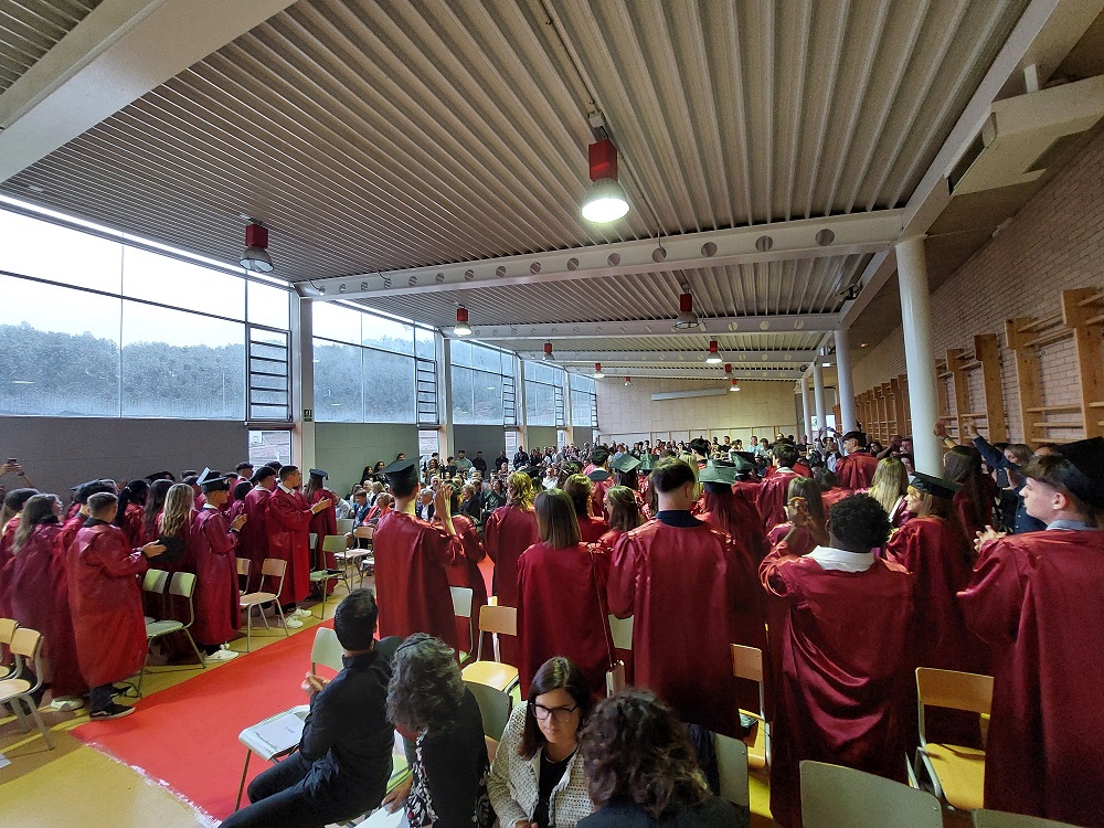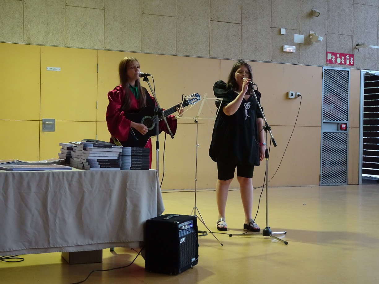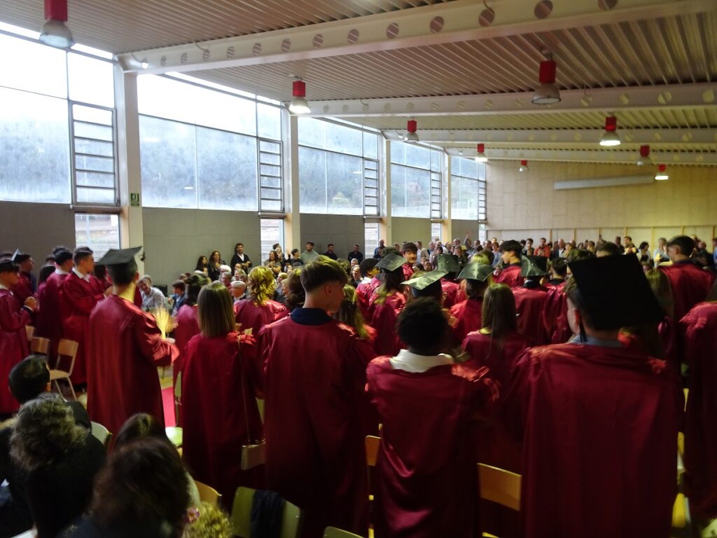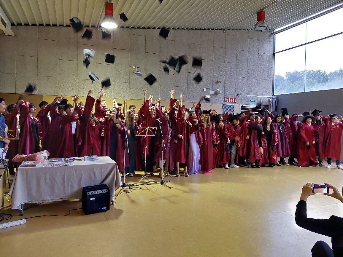 L’acte va ser conduït per l’alumne Martí Mèrida de primer de batxillerat, que s’hi va oferir molt amablement. Es va començar amb la magnífica actuació de dues alumnes de segon de batxillerat, l’Elisabeth González a la guitarra i la Carla González a la veu, que van interpretar “Escriurem” d’en Mikki Núñez. Tot seguit, el director del centre, en Lluís Virós, va dirigir unes paraules de comiat a l’alumnat, seguit de l’alcaldessa de Sant Fruitós, la sra. Àdria Mazcuñán, així com també del president de l’AFA, el sr. Rafael Paygès, que van agraïr la tasca del professorat i també van desitjar molta sort a tots els estudiants en aquesta nova etapa. Després se’ls va poder entregar les orles, les fotos de grup i també un exemplar del Llibre de Treballs de Recerca del Bages i Moianès 2023, on hi tenen publicat el resum del seu treball de recerca d’enguany.
