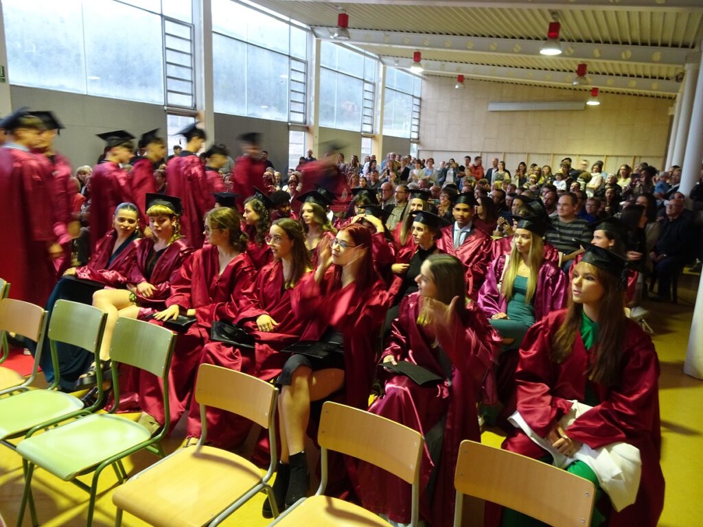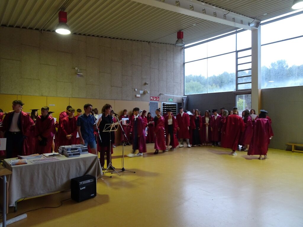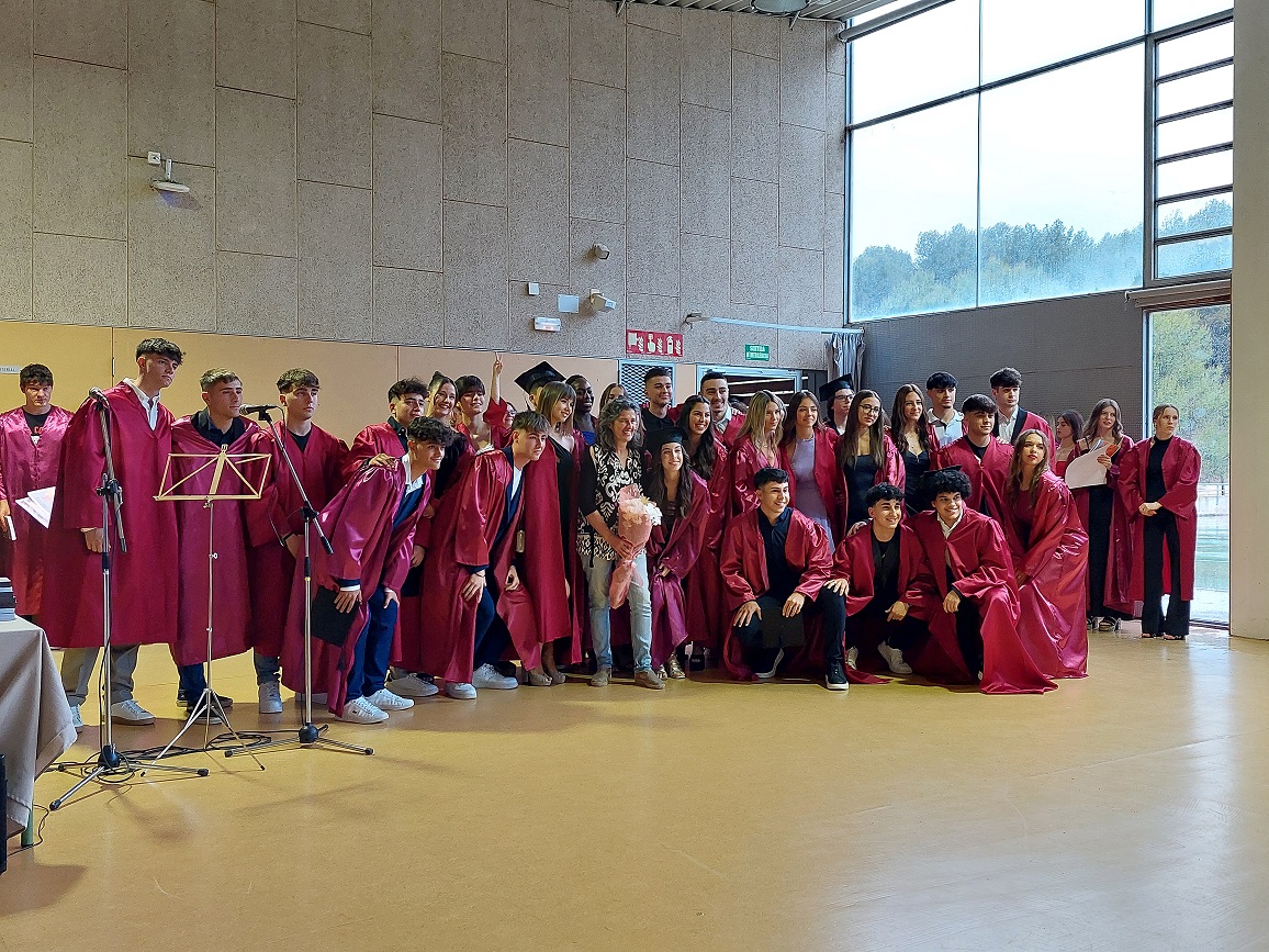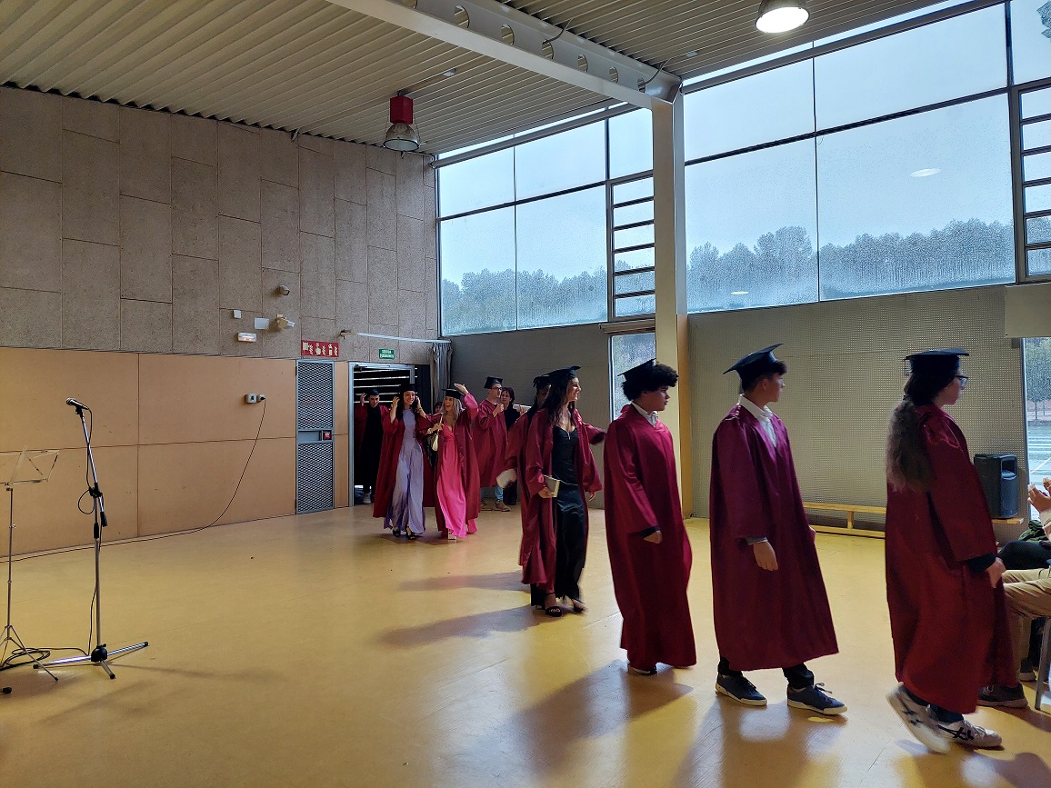 L’acte va ser conduït per l’alumne Martí Mèrida de primer de batxillerat, que s’hi va oferir molt amablement. Es va començar amb la magnífica actuació de dues alumnes de segon de batxillerat, l’Elisabeth González a la guitarra i la Carla González a la veu, que van interpretar “Escriurem” d’en Mikki Núñez. Tot seguit, el director del centre, en Lluís Virós, va dirigir unes paraules de comiat a l’alumnat, seguit de l’alcaldessa de Sant Fruitós, la sra. Àdria Mazcuñán, així com també del president de l’AFA, el sr. Rafael Paygès, que van agraïr la tasca del professorat i també van desitjar molta sort a tots els estudiants en aquesta nova etapa. Després se’ls va poder entregar les orles, les fotos de grup i també un exemplar del Llibre de Treballs de Recerca del Bages i Moianès 2023, on hi tenen publicat el resum del seu treball de recerca d’enguany.
