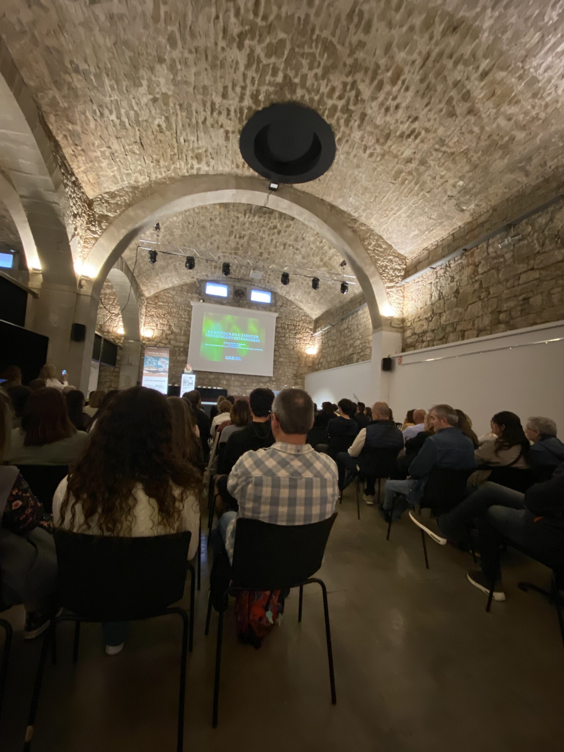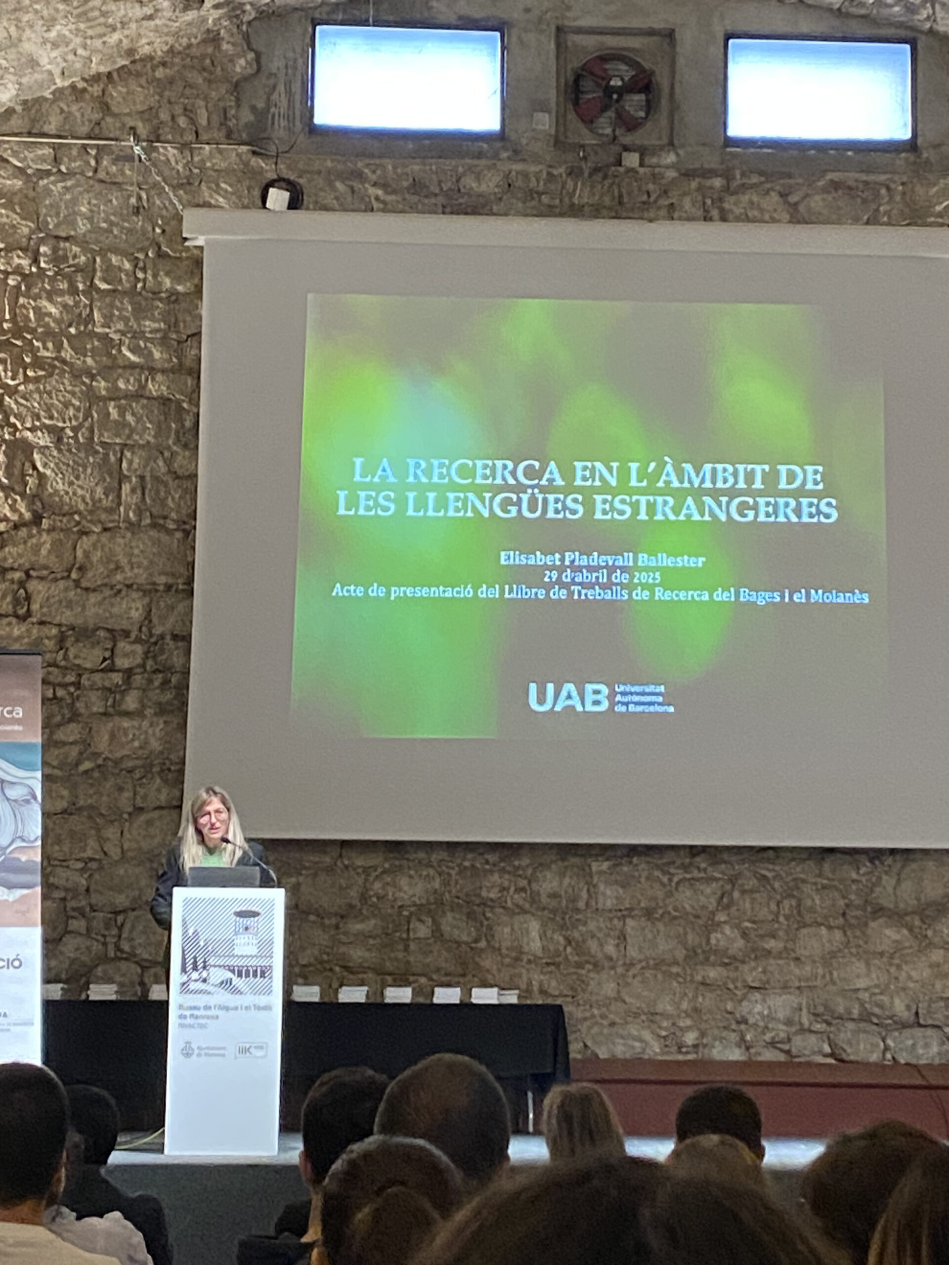 Enguany la ponent convidada a l’acte va ser l’Elisabet Pladevall Ballester, doctora en filologia anglesa i investigadora en adquisició i aprenentatge de les llengües, que ens va presentar la conferència “La recerca en l’àmbit de les llengües estrangeres”. Ens va parlar de l’adquisició i aprenentatge de les llengües, fent èmfasi en l’aprenentatge de les llengües estrangeres, que ella va definir com un procés lent i multifactorial. Ens va convidar a relaxar les expectatives socials i familiars que tots tenim de cara als infants que estan aprenent l’anglès a les aules, que ella anomena situacions de “minimal input” però a la vegada també a tenir en compte la neuroplasticitat d’un infant si pot gaudir d’una situació d’immersió.