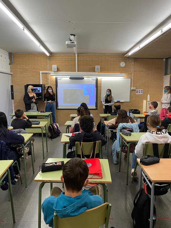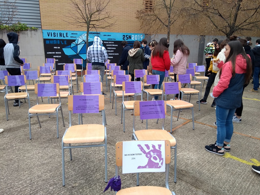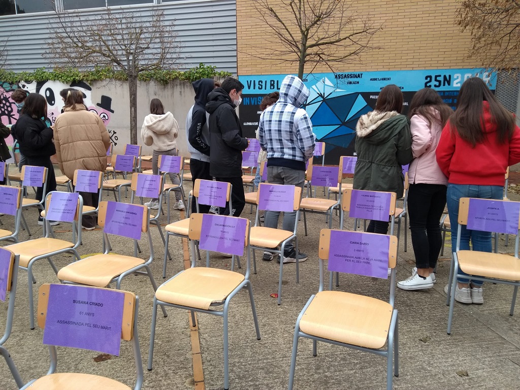 En primer lloc es va presentar una activitat de reflexió a tot l’alumnat d’ESO. Posteriorment, es van instal·lar un total de 48 cadires al pati triangular amb el nom de les persones assassinades per les seves parelles i/o pares per tal de ser recordades.