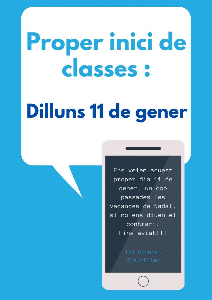Aquest proper dilluns dia 11 de gener reprenem les classes després de les vacances de Nadal. Ens veiem doncs la setmana vinent. Si hi ha hagués qualsevol canvi de darrera hora, us informaríem de seguida a través de la web i els altres canals habituals.