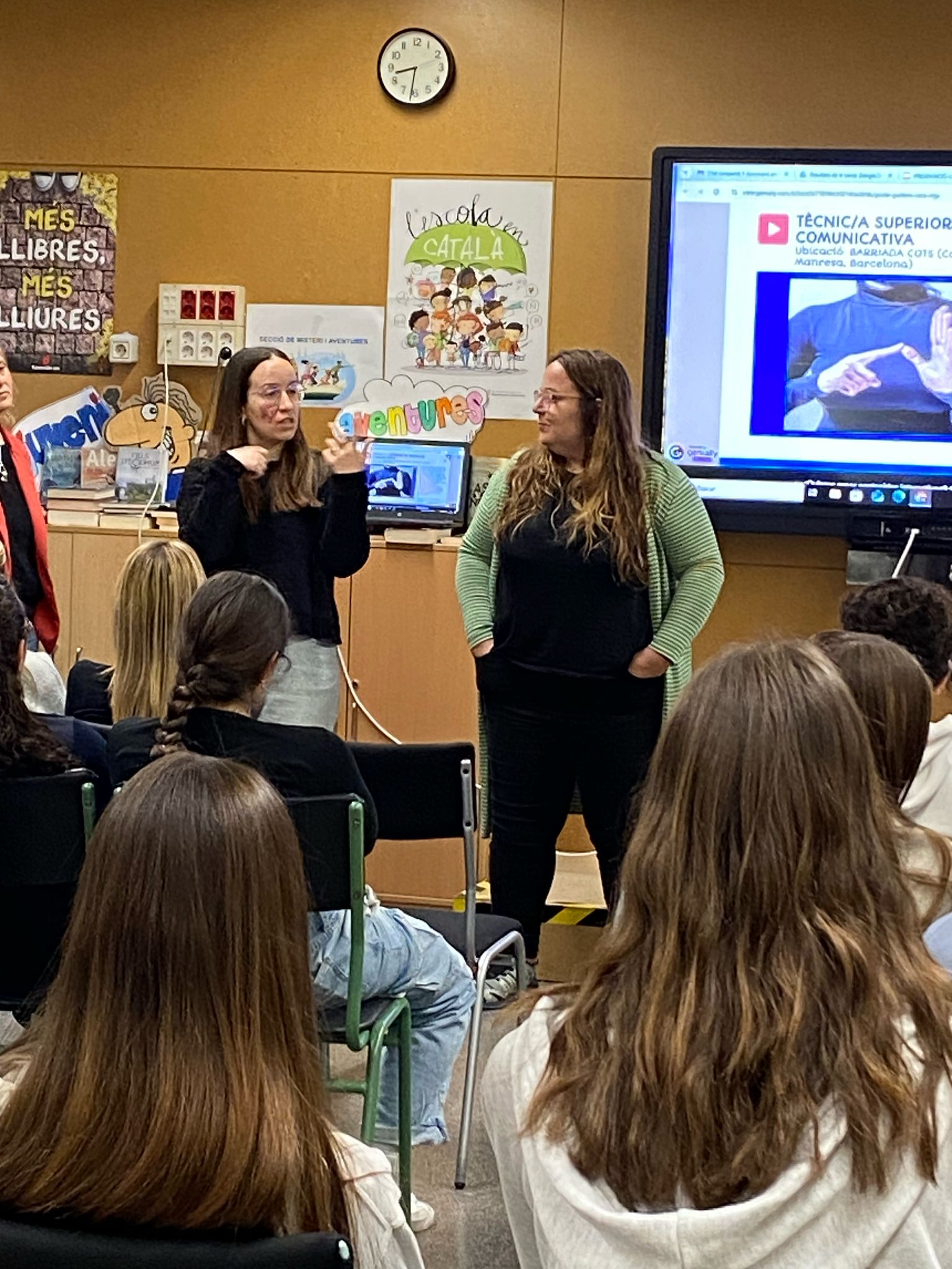 Una part molt interessant de la sessió ha estat precisament la intervenció de dos alumnes actuals del cicle d’Animació Sociocultural i Turística, que no només els han informat de la part més pràctica dels estudis sinó també del vessant més realista de les seves pròpies trajectòries.