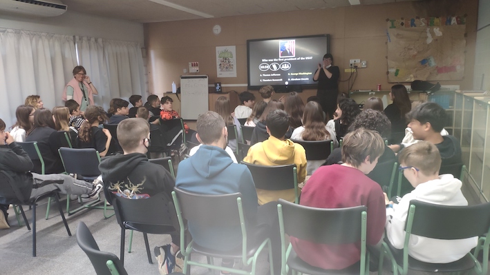 Durant la xerrada els nois i noies van tenir l’oportunitat de participar en un joc de preguntes a l’estil del popular programa de televisió «Who wants to be a millionaire?» i interactuar en anglès amb la nostra conferenciant d’origen americà. Us deixem a continuació algunes fotografies de l’activitat.
