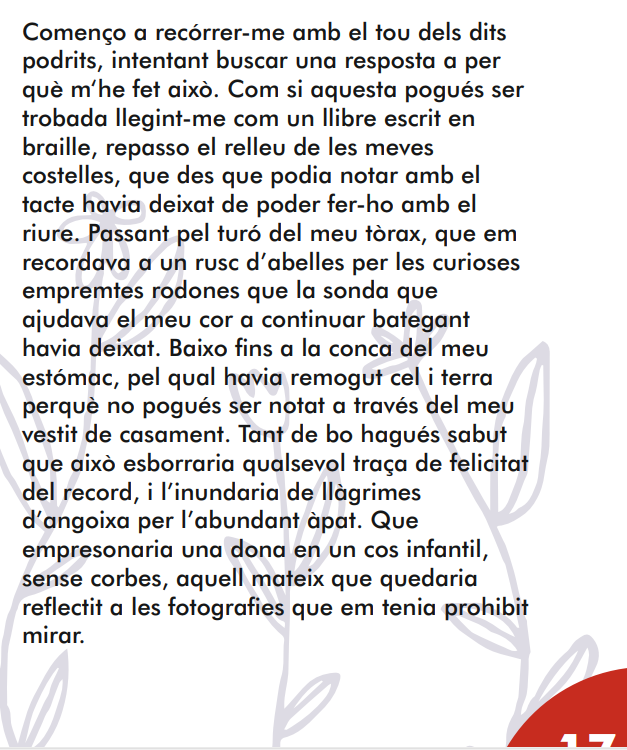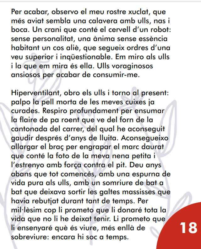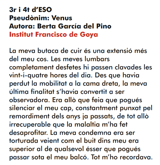 “Per fi disposem del llibret de textos seleccionats per als Jocs Florals Escolars de Barcelona, certamen literari en què la nostra alumna de 4t Berta Garcia va obtenir el primer premi en la categoria de prosa de 2n cicle de l’ESO. Ara podrem llegir el seu intens relat Presó de carn. Enhorabona Berta per oferir-nos aquesta qualitat literària tan brillant! Des del Goya desitgem que continuïs explotant el teu talent literari. ”