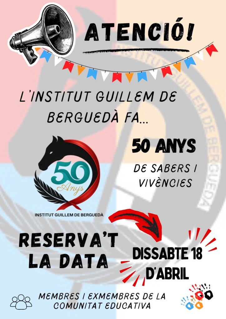 Ens fa molta il·lusió presentar el programa d’actes que es duran a terme els dies 17 i 18 d’abril de 2026, en motiu de la celebració del 50è aniversari de l’Institut Guillem de Berguedà. El dissabte 18 d’abril es farà un dinar per tothom qui treballi o hagi treballat a l’institut. En el programa hi