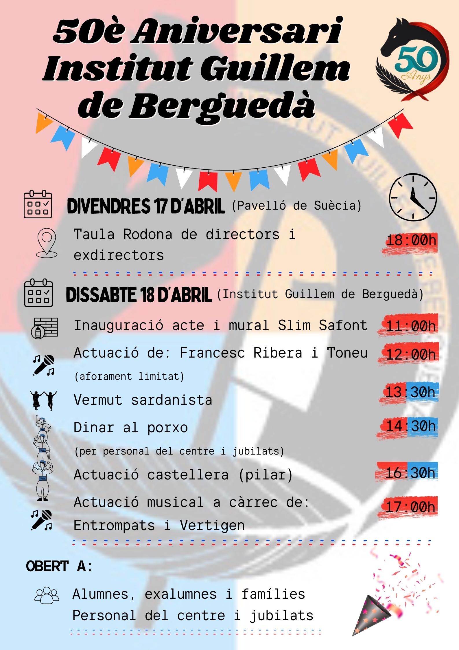 Ens fa molta il·lusió presentar el programa d’actes que es duran a terme els dies 17 i 18 d’abril de 2026, en motiu de la celebració del 50è aniversari de l’Institut Guillem de Berguedà.
