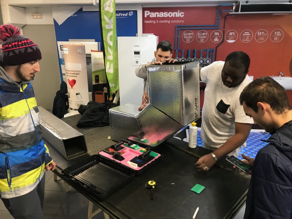 Un grup d’alumnat d’Instal·lacions frigorífiques i de climatització ha pogut gaudir del curs de construcció de conductes d’aire amb panells de fibra Climaver a les instal·lacions de Comfred Suministros. El curs, impartit per professionals de la marca i de dues jornades de durada, els ha permès adquirir els coneixements pràctics per a la construcció i instal·lació d’aquest tipus de xarxes de conducció d’aire. Un complement magnífic per a la seva formació.