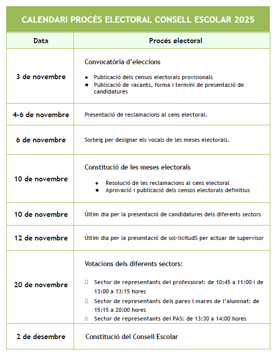 Aquest mes de novembre es faran a l’institut eleccions al Consell Escolar. El consell escolar del centre és l’òrgan col·legiat de participació de la comunitat escolar en el govern del centre. En el consell escolar hi ha representats tots els col·lectius que intervenen en la comunitat educativa: director/a, professorat, alumnes, personal d’administració i serveis, etc.