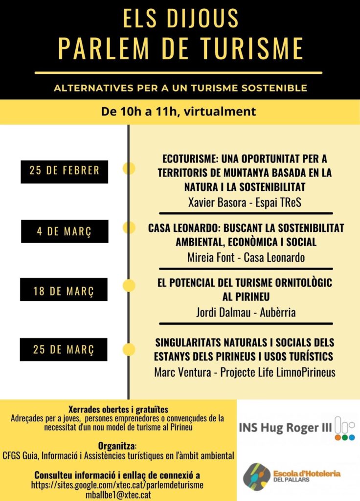 Aquest dijous hem acabat el cicle de les quatre xerrades virtuals de Parlem de turisme: Alternatives per a un turisme sostenible que s’han organitzat des del cicle de turisme amb la voluntat de posar un granet de sorra per a potenciar l’ecoturisme, el respecte pel nostre entorn i un turisme que el promocioni d’una forma coherent.