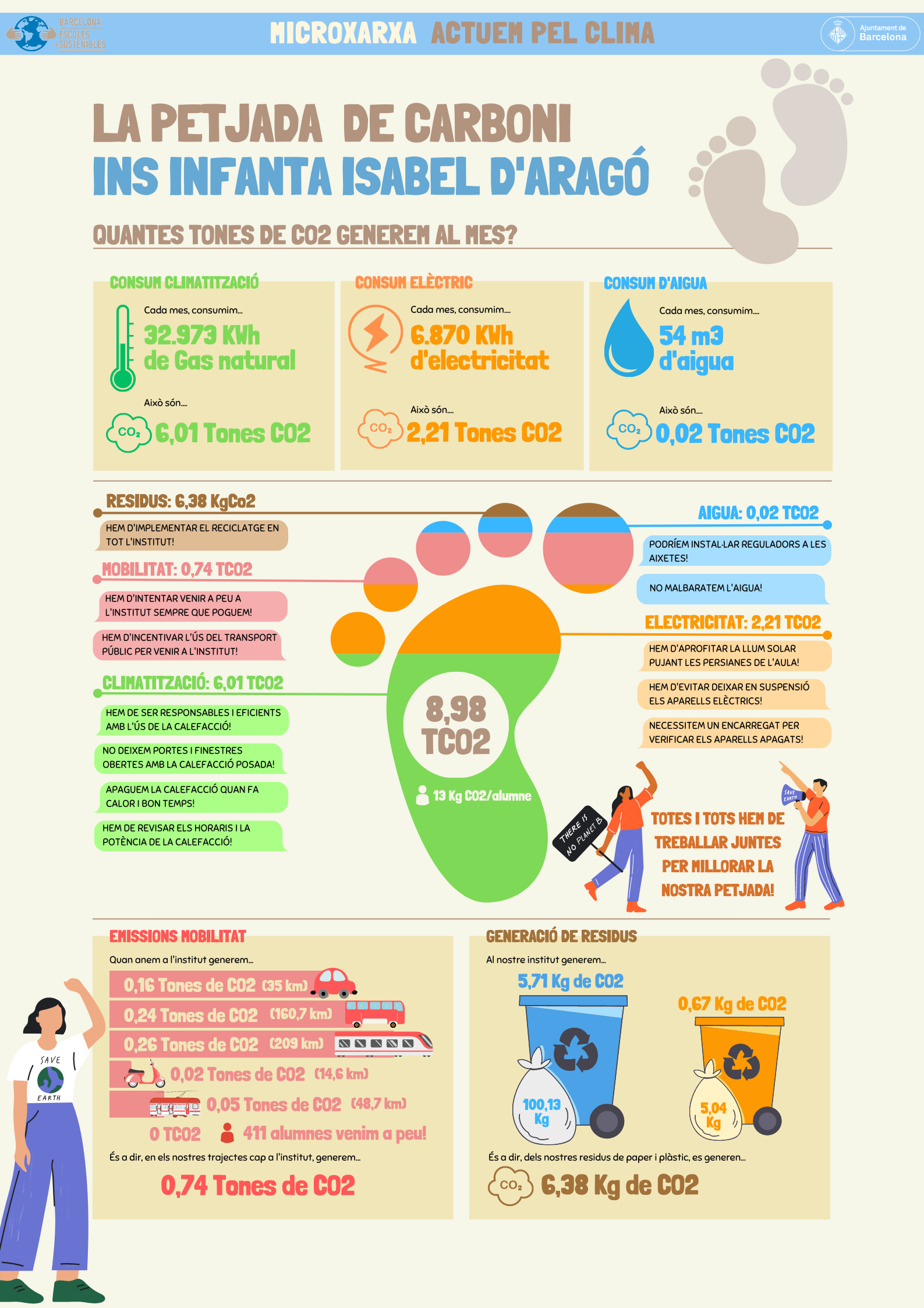 Des de l’optativa de 1r d’ESO VerdCelOna hem participat a la microxarxa “Actuem pel clima” durant el primer i segon trimestre per empoderar-nos en la lluita contra el canvi climàtic i avançar cap al desenvolupament sostenible i la neutralitat d’emissions. Juntament amb 6 instituts més de Barcelona hem anat seguint els passos necessaris per arribar a calcular la petjada de carboni del centre. En aquesta infografia podeu veure els nostres resultats:
