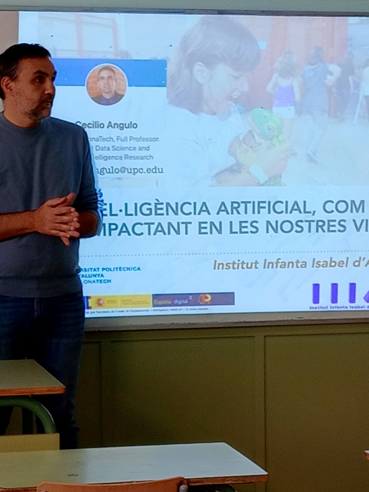 El passat dimecres, 17 de gener, el doctor en ciències Cecilio Angulo, del Departament d’Enginyeria de Sistemes, Automàtica i Informàtica Industrial de la UPC, va venir al nostre institut per fer una xerrada titulada “Intel.ligència artifical, com està impactant a les nostres vides?”* . L´alumnat oient, de l´optativa de Cultura científica de 4t d´ESO, va poder aprendre sobre les bases i aplicacions dels diferents tipus d’IA, així com el bon ús de les xarxes socials i la importància de l´esperit crític davant la IA generativa.