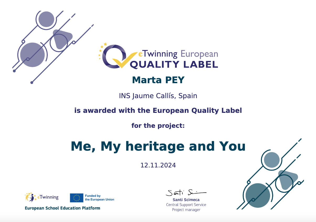 El projecte ME, MY HERITAGE AND YOU, realitzat per alumnes de 4t ESO el curs passat 2023-24, obté el Segell de Qualitat Europeu eTwinning.