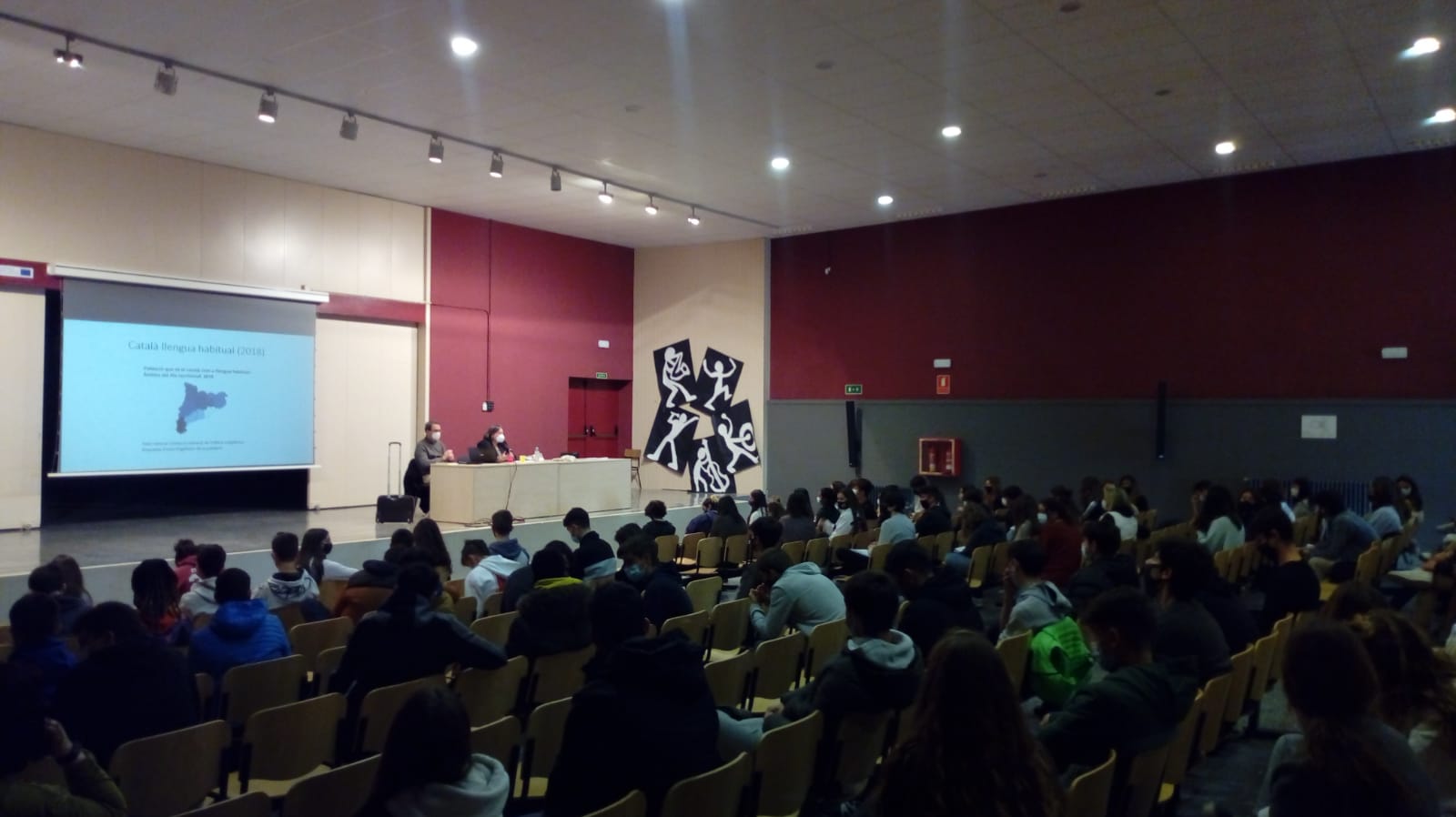 Avui, dijous 22 d’abril, vigília de Sant Jordi, la professora de lingüística a la Universitat de Barcelona M. Carme Junyent, experta en l’àmbit de les llengües amenaçades, ha pronunciat una conferència sobre el futur de la llengua catalana per a tots els alumnes dels quatre grups de 1r de batxillerat del nostre institut. La professora Junyent ha captat l’atenció dels estudiants i ha fet una exposició que ha sigut del seu interès durant la primera part; a continuació, ha respost diverses preguntes que li han adreçat els alumnes, preguntes algunes de les quals ja estaven preparades. L’organització de l’acte ha anat a càrrec del departament de llengua catalana i literatura seguint l’objectiu de presentar informació contrastada als estudiants de batxillerat sobre la situació actual de la nostra llengua.