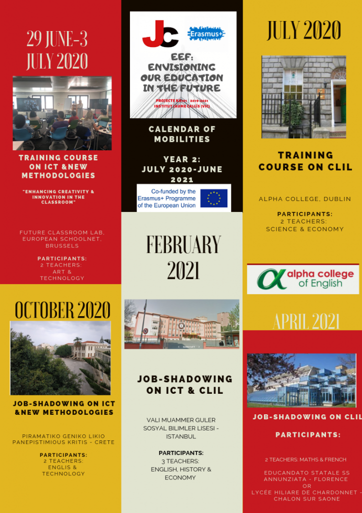 El projecte KA1 “Envisioning our Future Education” té una durada de 2 anys lectius, en els quals un nombre important de professors es formaran en cursos estructurats en centres de formació de Malta, Irlanda i Bèlgica, i també faran observacions (job-shadowing) a instituts italians, grecs, turcs i francesos, en els àmbits de CLIL, STEAM i TIC i noves metodologies.