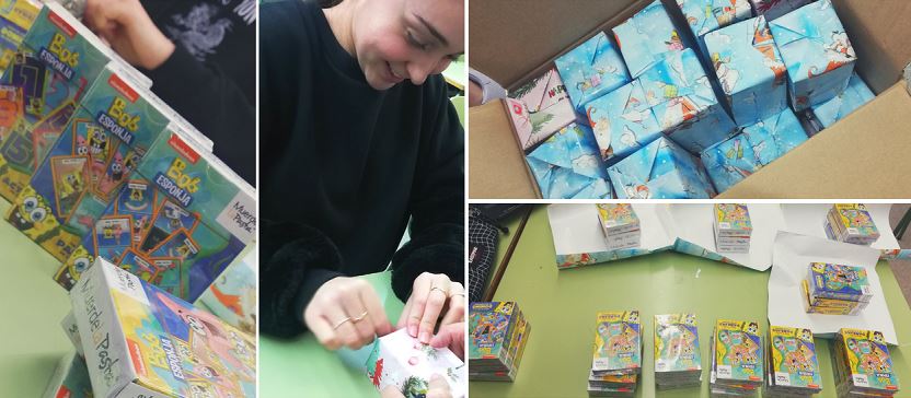 L’Institut Jaume Mimó va col·laborar aquestes passades festes amb la campanya “Cap nen sense joguina” promoguda per la Cadena SER Barcelona, embolicant jocs de cartes per a què tots els nens i nenes rebessin els seus regals empaquetats per Reis. Ho han fet possible els alumnes de 1r del CFGM d’Activitats Comercials amb l’ajuda d’alguns