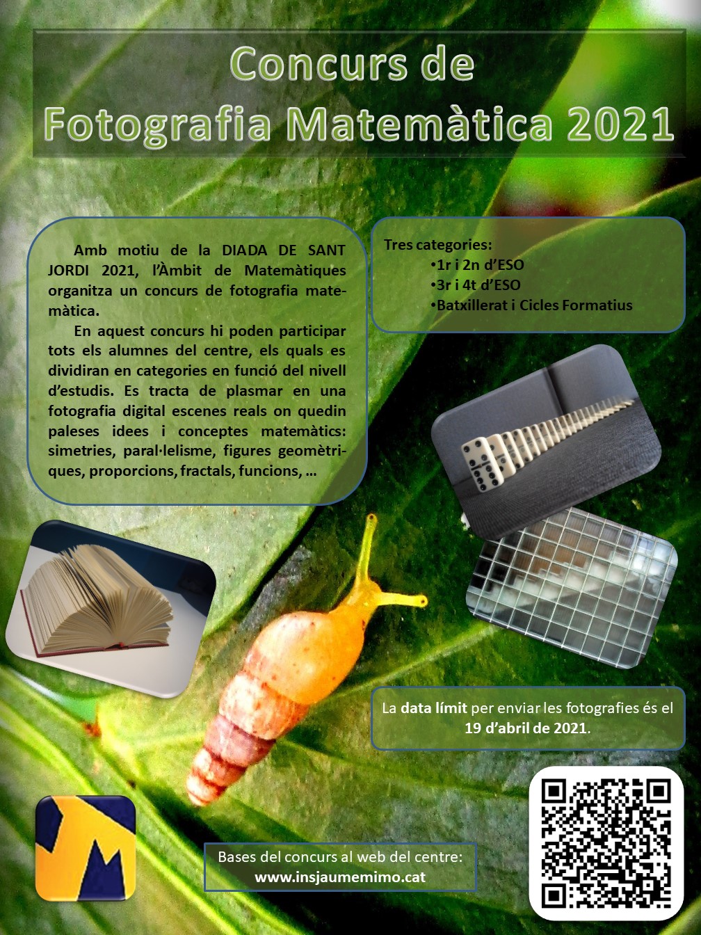 Amb motiu de la Diada de Sant Jordi l’Àmbit de Matemàtiques, Ciències, E. Física i Tecnologia organitza un concurs de fotografia matemàtica. En aquest concurs hi poden participar tots els alumnes del centre, els quals es dividiran en categories en funció del nivell d’estudis. Es tracta de plasmar en una fotografia digital escenes reals on quedin paleses idees i conceptes matemàtiques: simetries, paral·lelisme, figures geomètriques, proporcions, fractals, funcions, …