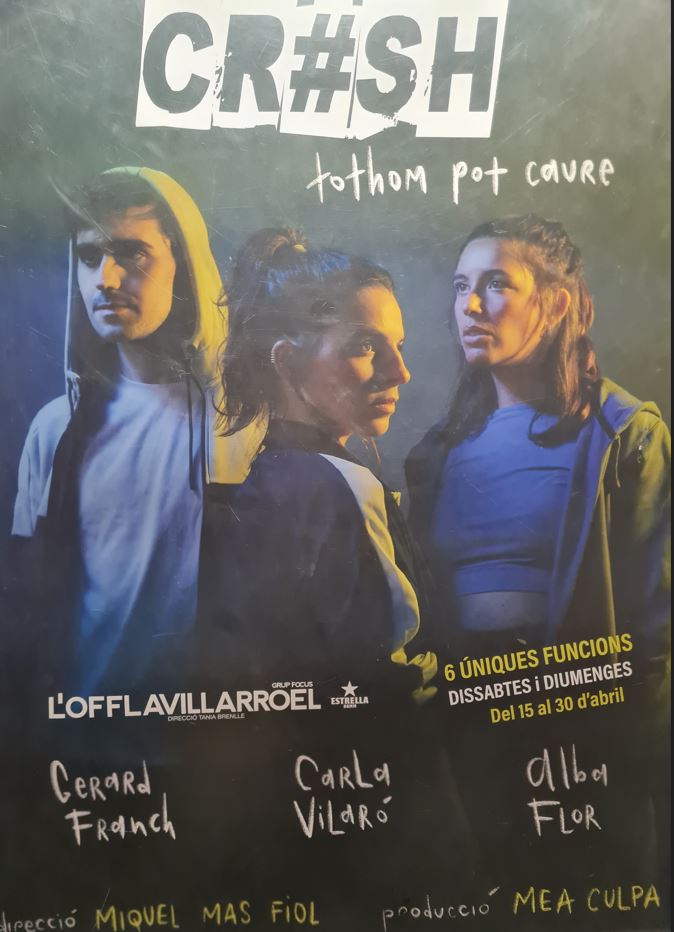 L’alumnat de 3r i 4t d’ESO va assistir al teatre La Villarroel de Barcelona per veure l’obra “Cr#sh (tothom pot caure)”. Es tracta d’un espectacle molt dinàmic pel seu ritme i molt pròxim al públic adolescent per les temàtiques que engloba. A un ritme frenètic, el Gerard Franch, la Carla Vilaró i l’Alba Flor van