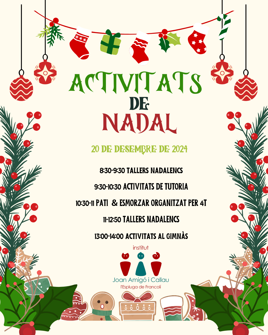 🎄🎄ACTIVITATS DE NADAL🎄🎄 Feu un comentari / Per Institut / 04/12/2024 / ESO Portada / Nadal Aquestes són les activitats previstes pel dia 20 de desembre a l’institut. Esperem que gaudiu molt de la jornada. #insjoanamigoicallau #nadal2024 #christmas2024