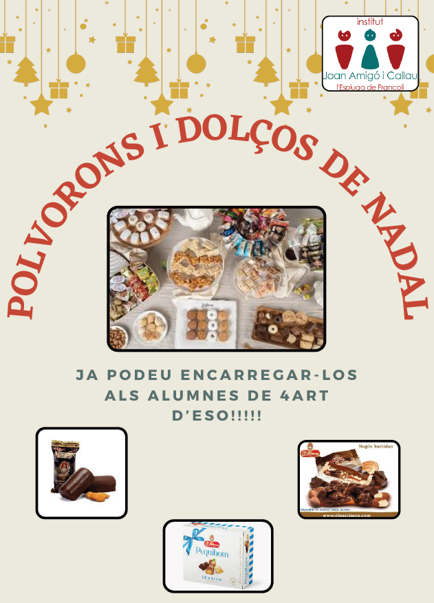 Venda de polvorons i dolços dels alumnes de 4t d’ESO Feu un comentari / Per Institut / 19/10/2024 / Portada Us informem que ja s’ha iniciat la venda de polvorons i dolços dels alumnes de 4t d’ESO. Moltes gràcies