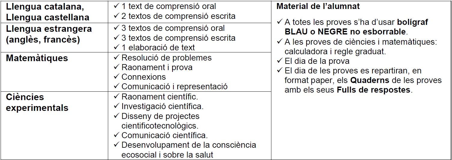 En concret, la prova avalua les competències específiques de les matèries següents: Matemàtiques, Llengua Catalana i Literatura, Llengua Castellana i Literatura, Llengua Anglesa i Ciències Experimentals.